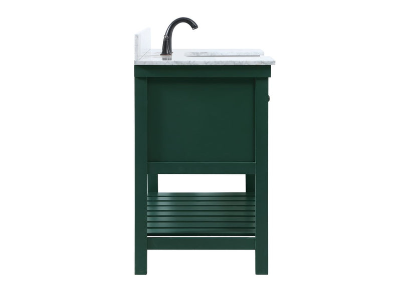 Make the most of your space with this farmhouse style bathroom vanity. Complements well with its beautiful finish, Carrara white marble countertop, and the contemporary slender handle bar that sits on the functional drawers with soft closing mechanism, allowing you to store an assortment of bathroom essentials. The lower shelf makes it the perfect space to hold new towels for your guests. This stylish vanity ensures both form and function in your bathroom for you and your guests.