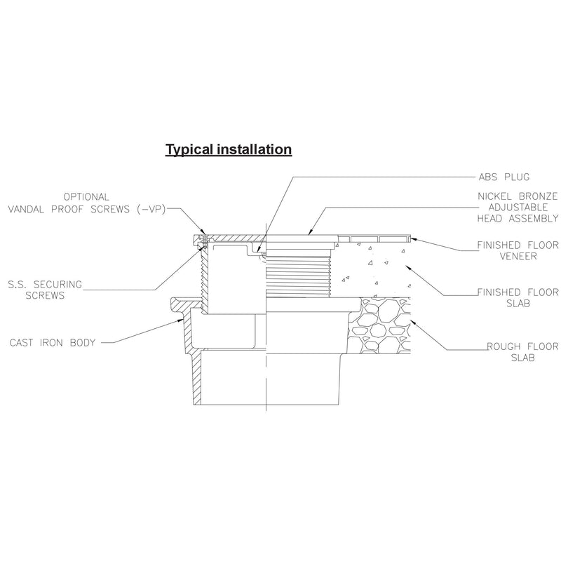 - Zurn's finished floor cleanout with cast iron body and nickel bronze top with 4" No-Hub Outlet