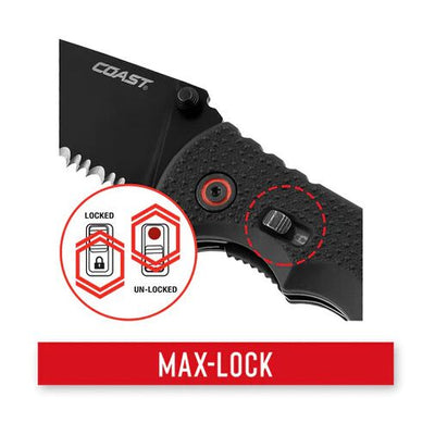 MAX-LOCK: Take safety to the extreme. COAST knives equipped with the Max-Lock system can lock the blade in either the open or closed position. Locking the blade closed prevents the assisted opening mechanism from accidentally engaging in your pocket. Locking the blade open protects your fingers from an accidental closure during use. Knives with Max-Lock also have a standard Liner-Lock to make the knives twice as safe.
