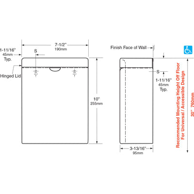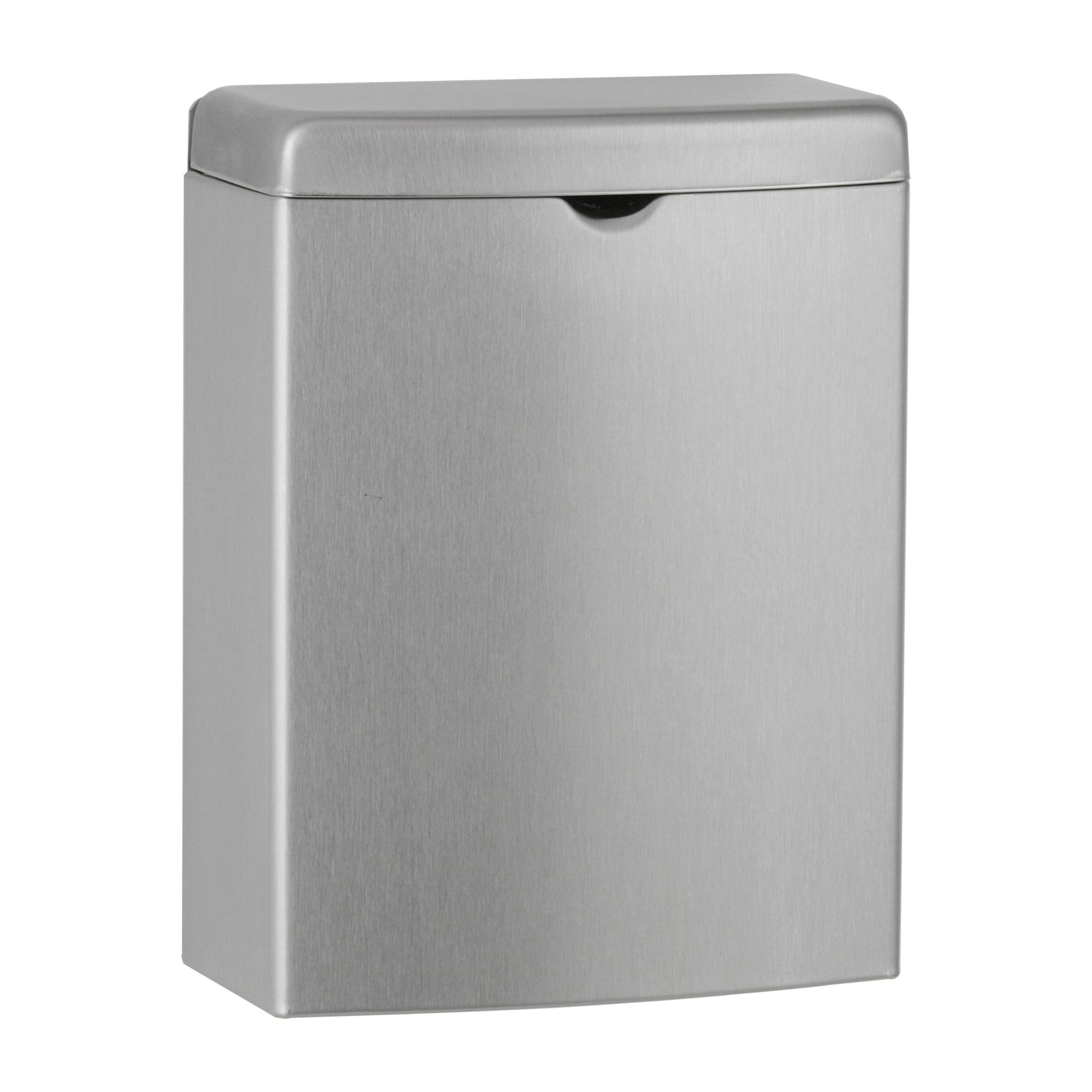 - Container — 18-8, type-304, 22-gauge (0.8mm) stainless steel. All-welded construction. Exposed surfaces have satin finish. Integral finger depression for opening cover. Front of container has same degree of arc as front of cover and other Bobrick ConturaSeries washroom accessories. Radius on side edges of container match corners and edges of cover and other ConturaSeries accessories.