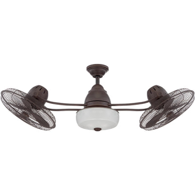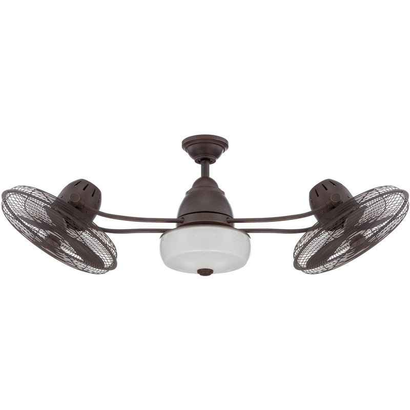 Cool times II. Add retro-industrial appeal indoors or out with the dual-headed Bellows II damp-rated cage ceiling fan. Two heavy-duty, three-speed motors crank out the airflow, as twin cage fans tilt 80 degrees around the integrated, but optional, light kit. The fan also has a third motor that operates the rotation of the two motors in a 360 degree fashion. Choose from Aged Bonze Textured or Stainless Steel finishes.