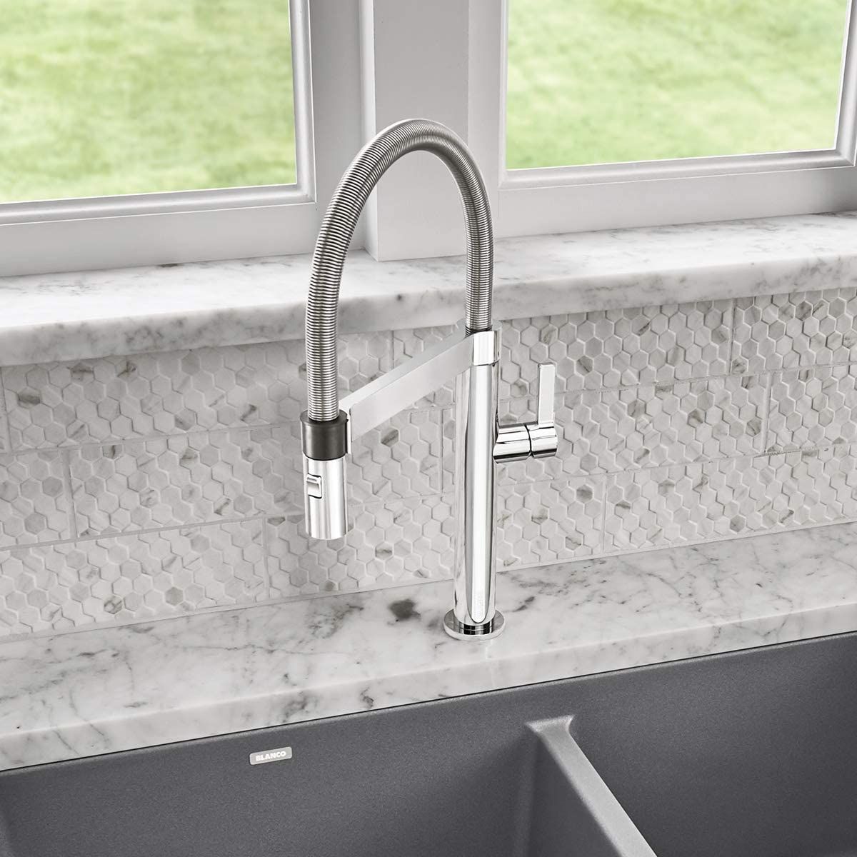 The BLANCOCULINA MINI SEMI-PRO KITCHEN FAUCET is the smaller version of the original pioneer for this acclaimed design, which has received numerous prestigious awards. It is the ultimate chef’s faucet – redefined with elegant lines and a breakthrough magnetic hook up with closed coil that offer effortless performance without entanglement.
