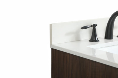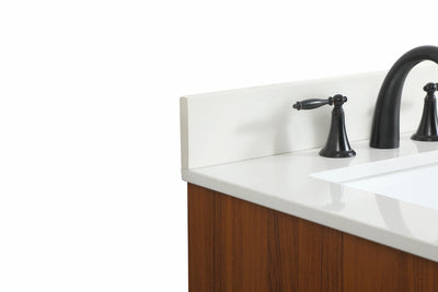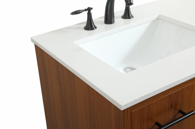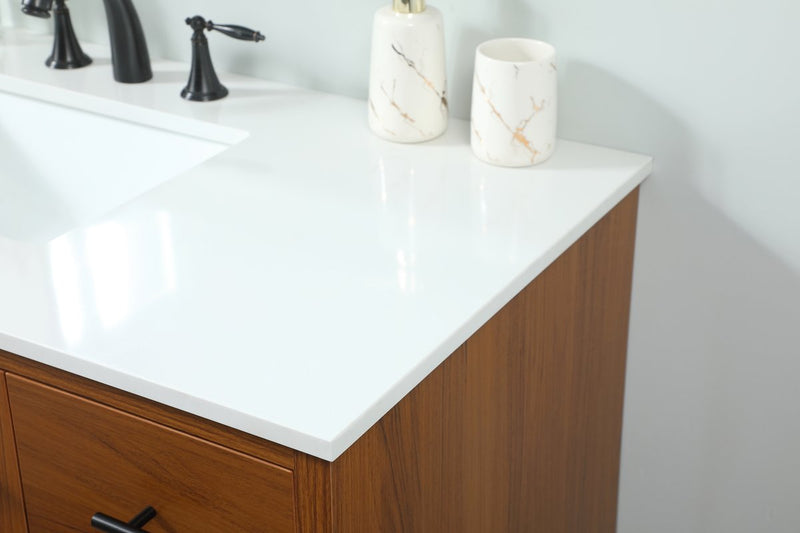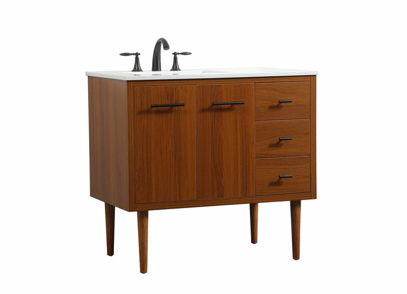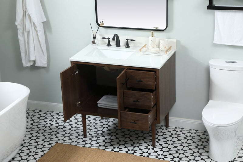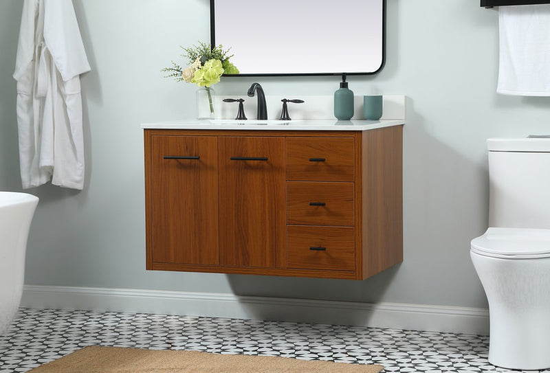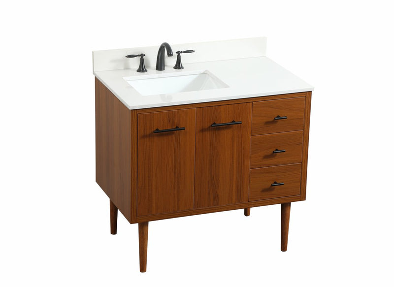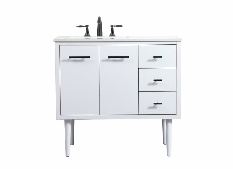 Delve into a world of minimalistic fashion and contemporary styling with this midcentury modern vanity. The clean lines anchors the design, while the straight tapered cylinder legs add subtle interest. Bar pull handle adorns the soft closing door hiding the base of the rectangular porcelain sink and letting you store your bathroom necessities and toiletries. Three soft closing drawers add plenty of storage option. Whether you want to use this as a floating vanity or a freestanding vanity, the choice is yours. The durable ivory white quartz countertop complements the manufactured wood base vanity and is built to last.