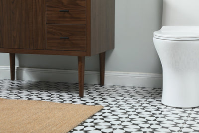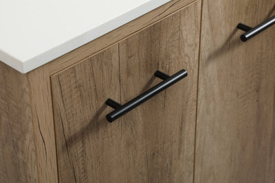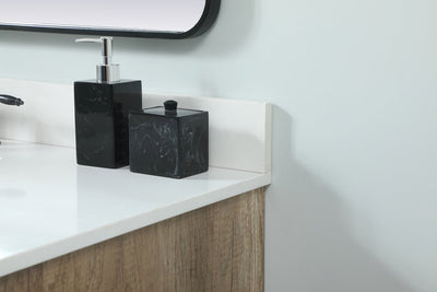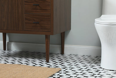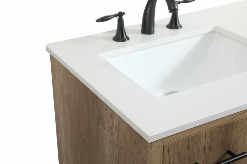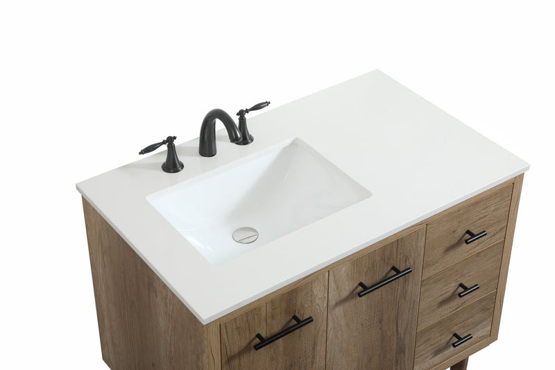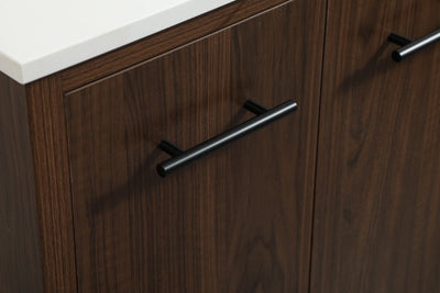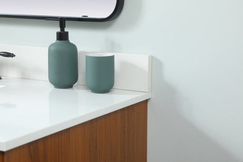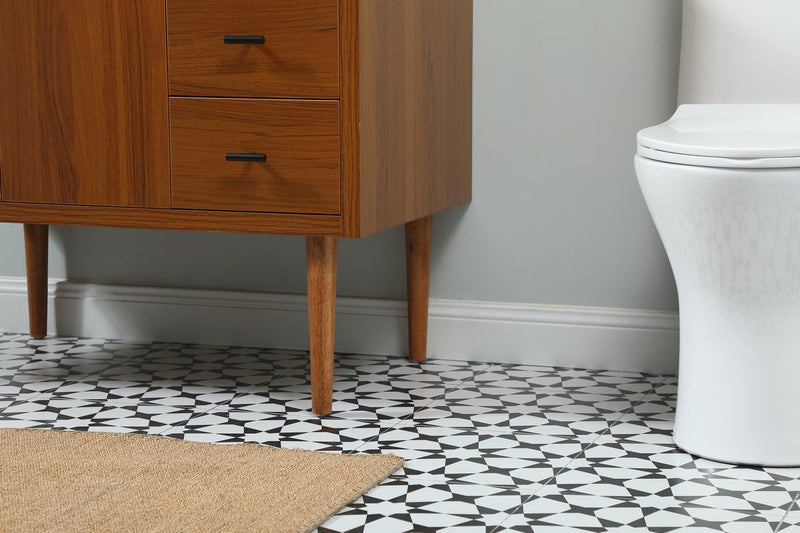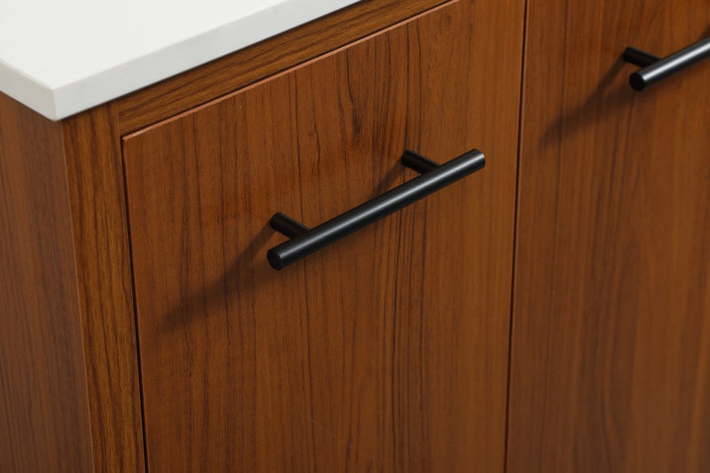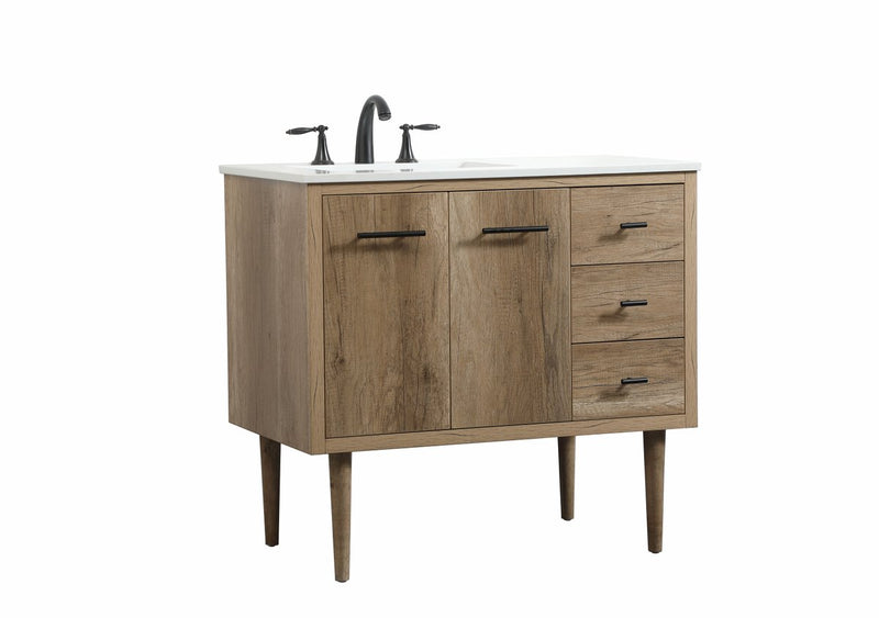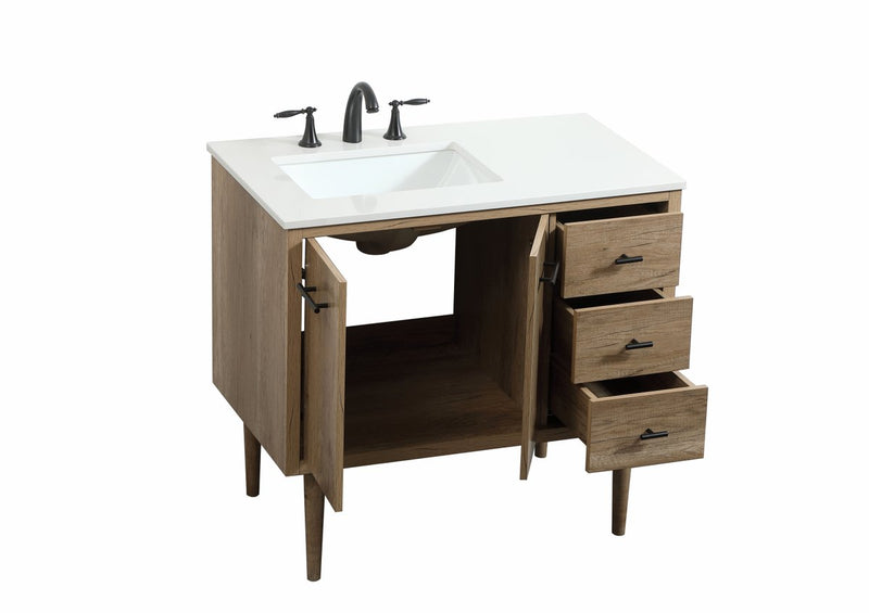 Delve into a world of minimalistic fashion and contemporary styling with this midcentury modern vanity. The clean lines anchors the design, while the straight tapered cylinder legs add subtle interest. Bar pull handle adorns the soft closing door hiding the base of the rectangular porcelain sink and letting you store your bathroom necessities and toiletries. Three soft closing drawers add plenty of storage option. Whether you want to use this as a floating vanity or a freestanding vanity, the choice is yours. The durable ivory white quartz countertop complements the manufactured wood base vanity and is built to last.