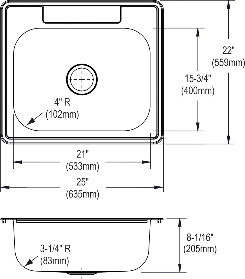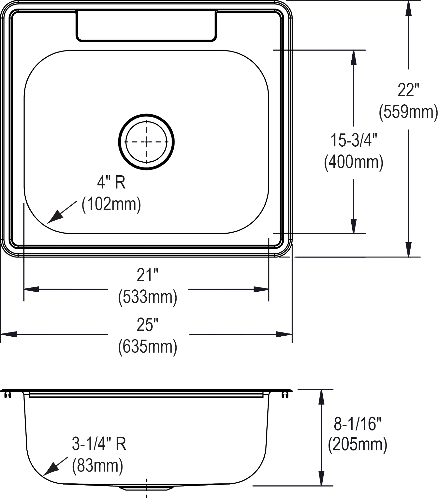 - CENTER DRAIN: Drain is conveniently placed in the center of the sink.
