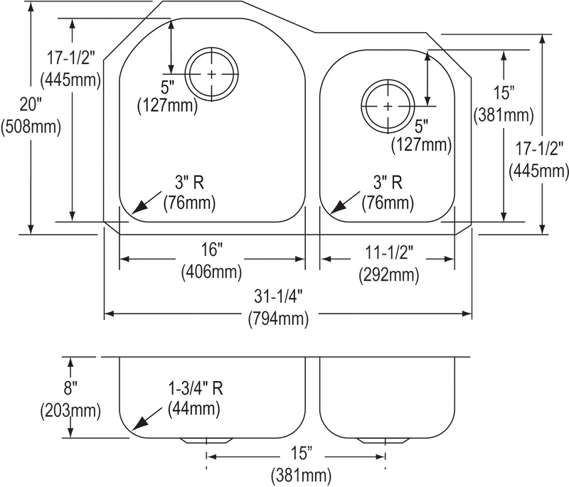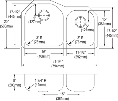 Elkay DXUH3119R - Dayton Stainless Steel 31-1/4" x 20" x 8", Offset 60/40 Double Bowl Undermount Sin
