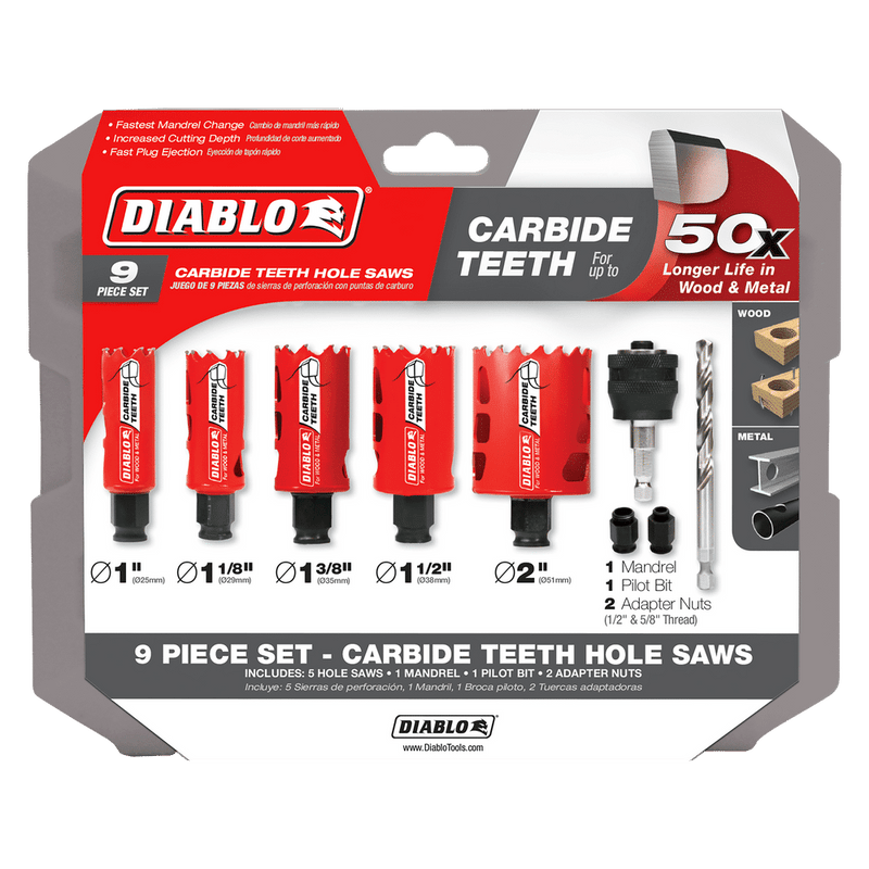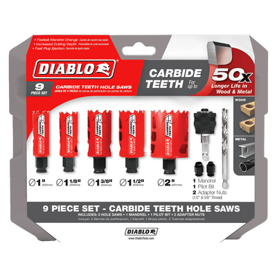 The Diablo 9-Piece General Purpose Carbide Hole Saw Kit features 5-carbide hole saw cups and Diablo's 4-piece SnapLock PLUS mandrel system for quick and easy hole saw cup changes for maximum job performance. This new, high performance carbide hole saw set delivers 50-times longer cutting life, faster cutting performance and increased productivity. Diablo's carbide hole saws are the industry's first carbide hole saws to cut both wood and metal. Unlike anything on the market, Diablo's hole saw system and mandrel design simplify the attachment process for fast and efficient hole saw mounting. These radical new hole saws provide ultimate cutting length to bore deeper holes in a single pass; and a tool-free plug ejection and Variable Tooth Design for faster cuts.