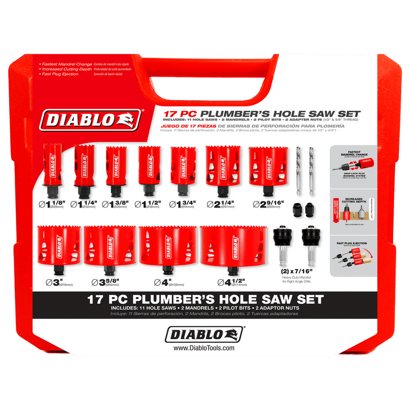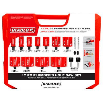 The Diablo 17-Piece Hole Saw Kit features five (11) bi-metal hole saw cups, 2 SnapLock PLUS mandrels, 2 pilot bits and 2 adaptor nuts (1/2" and 5/8") for quick and easy hole saw cup changes for maximum job performance. This new, high performance hole saw set delivers faster cutting performance and increased productivity versus standard bi-metal hole saws. Unlike anything on the market, Diablo's hole saws and SnapLock Plus mandrel system simplify the attachment process for fast and efficient hole saw mounting.