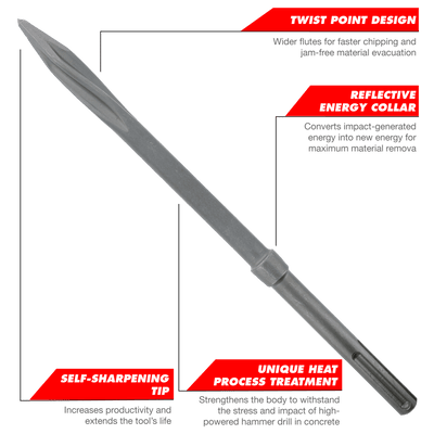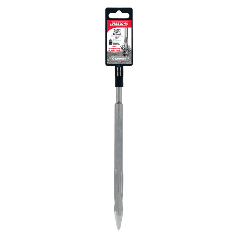 Diablo's SDS-Plus and SDS-Max Twist Point Chisels deliver extreme durability and stability in general demolition work and clearing reinforcements. The reflective energy collar converts impact-generated energy into new energy for maximum material removal. A unique heat treatment process strengthens the steel body to withstand the stress and impact of high-powered hammer drills. The Twist Point design provides wider flutes for faster chipping and jam-free material evacuation. Self-sharpening tip increases productivity and extends the tools life. Optimized for maximum performance in corded and cordless SDS-Plus and SDS-Max rotary hammers.
