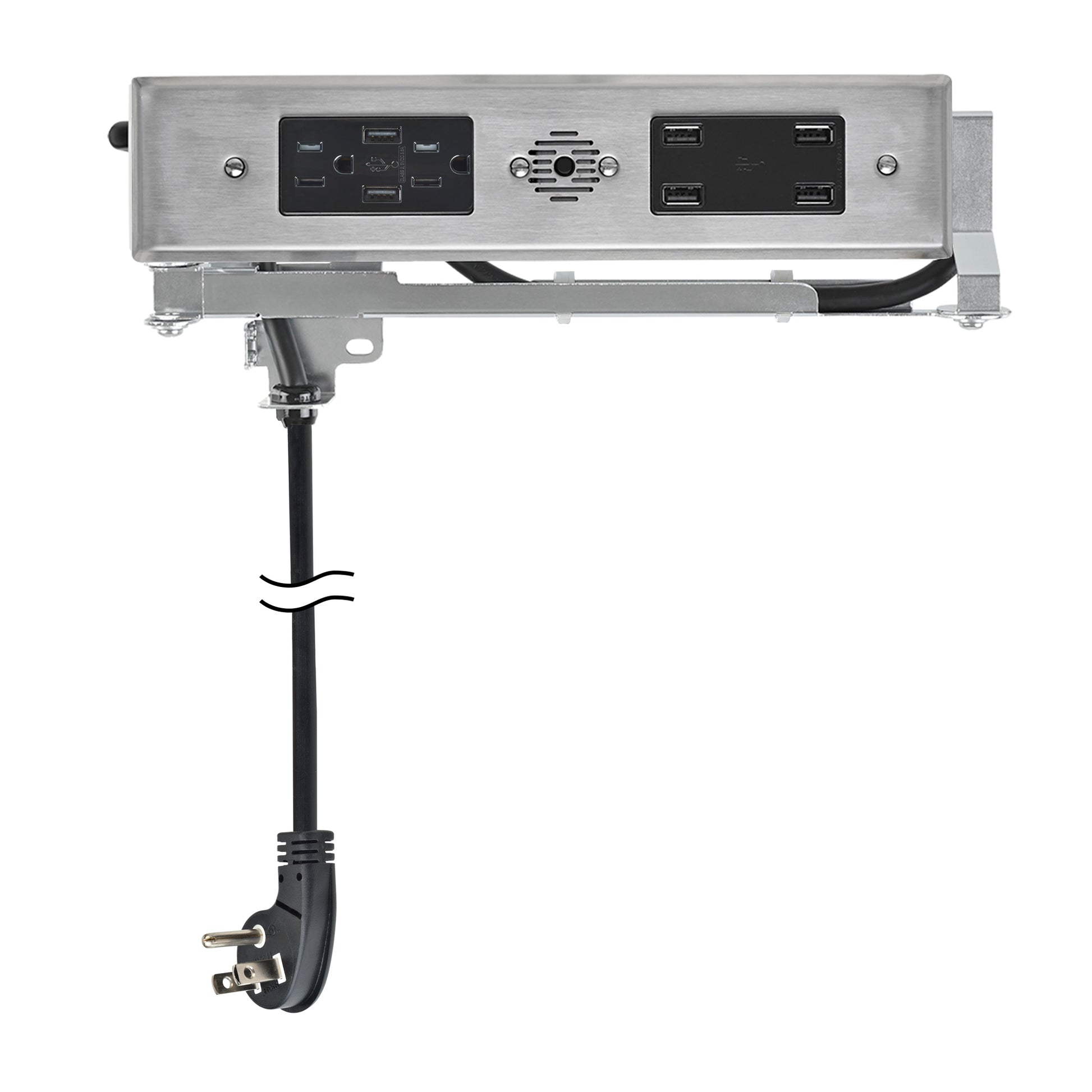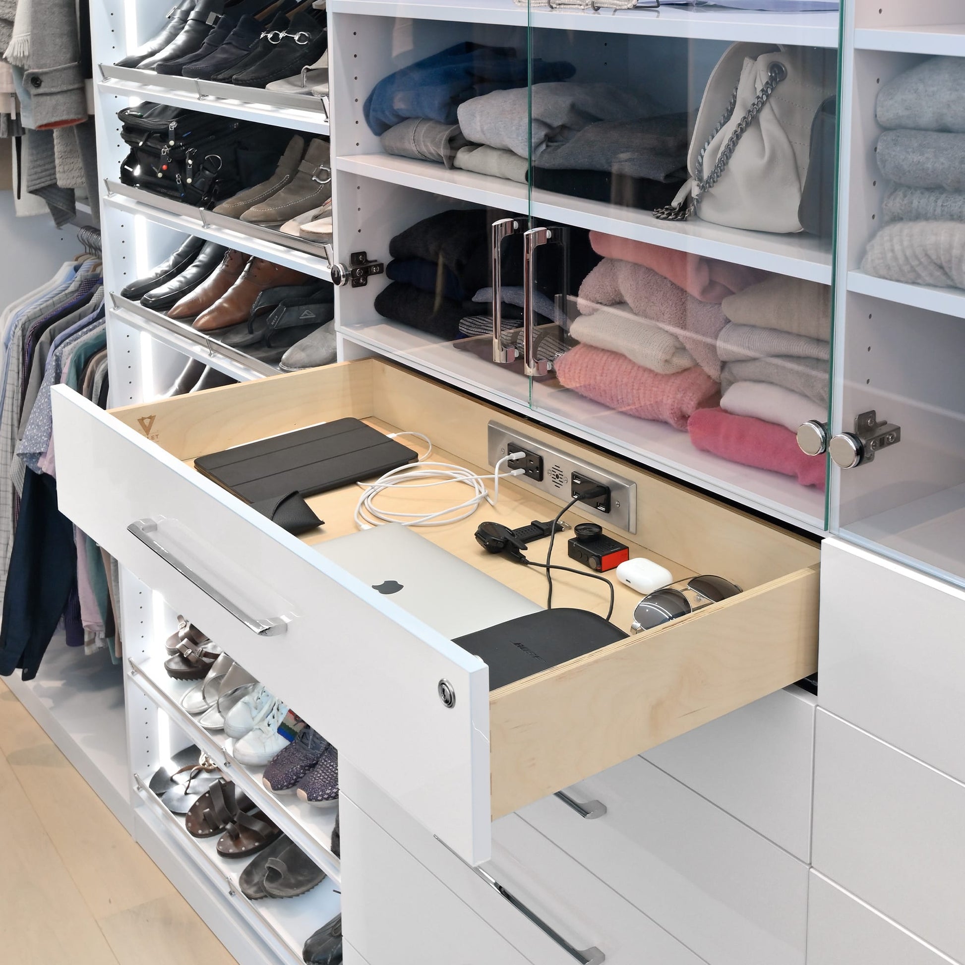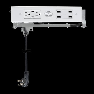 Docking Drawer outlets offer a safe and reliable way to add electrical outlets into cabinet and furniture drawers, clearing cord and device clutter from visible surfaces. Docking Drawer outlets can enhance the organization of any home or commercial space, while devices remain conveniently plugged in and at the ready. Create clutter free and organized spaces with safe in-drawer electrical outlets. Perfect addition to any kitchen, bathroom, vanity, nightstand, or office project. Will charge every type of technology or power hair dryers, curling irons, stand mixers and more.