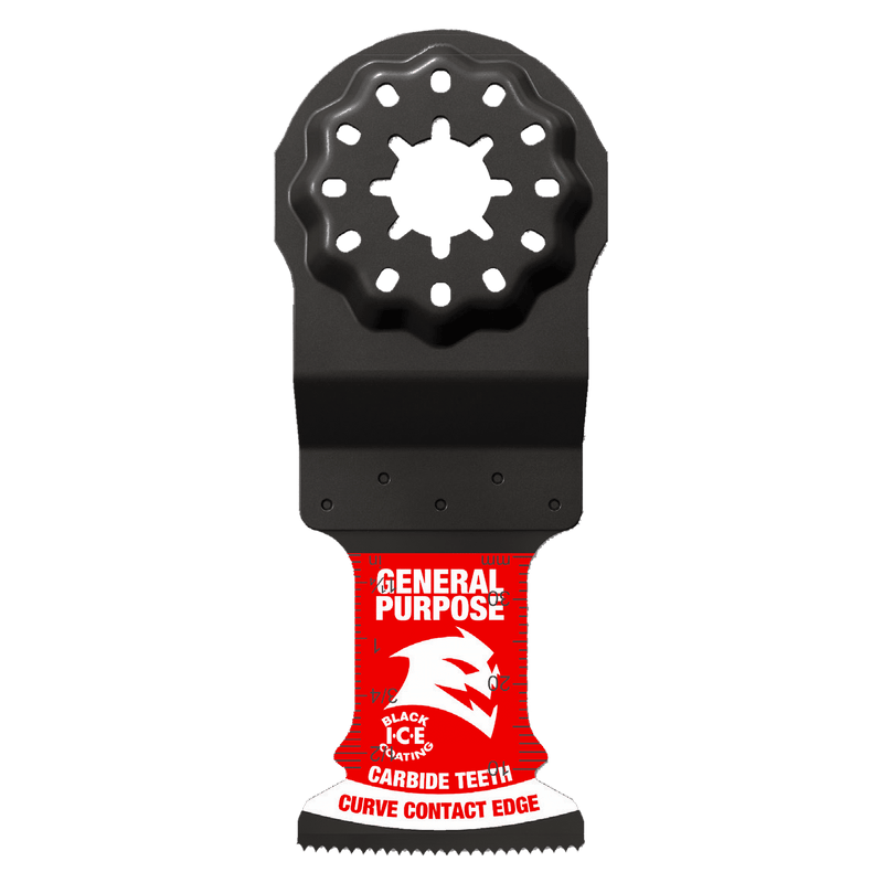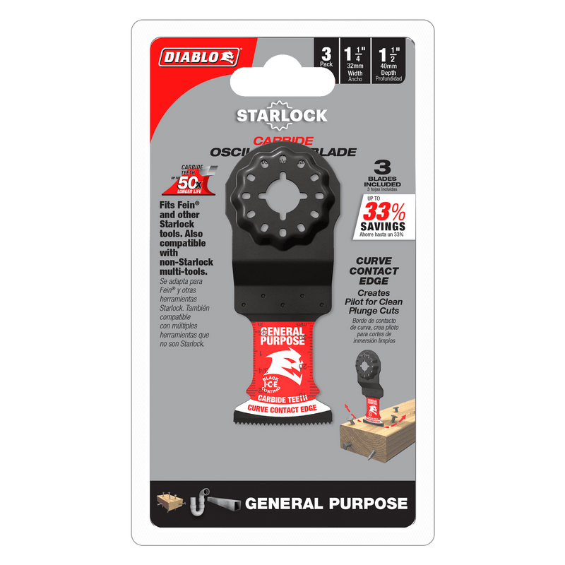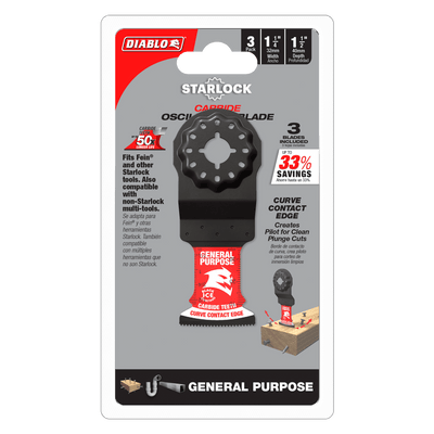Diablo's Starlock carbide oscillating blades feature application specific designs that deliver extreme durability and superior cutting life in general purpose cuts: nail-embedded wood, clean wood, metal and plastics. High-performance carbide teeth deliver an unmatched up to 50X longer cutting life versus standard bi-metal blades. Curve contact edge creates a pilot for precise, clean plunge cuts with less vibration. An optimized blade design and Black I.C.E. (Industrial Cooling Element) keeps the teeth cool and build up free for fast, clean cuts. Tool free quick-change interface fits Fein and other Starlock tools; also compatible with non-Starlock multi-tools.