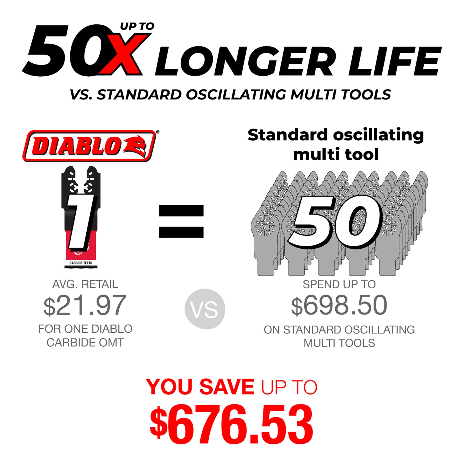 - High performance carbide for greater durability and up to 50X longer life versus standard bi-metal blades