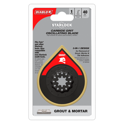 Diablo's Starlock oscillating sanding blades feature application specific designs that deliver maximum durability and longer life in grout, mortar and tile adhesive removal applications. The 40-Grit sanding plate removes material and routes joints on wall and floor tiles. A Carbide Grit Tip removes grout and mortar from hard to reach areas and tight corners. Tool free quick-change interface fits Fein and other Starlock tools; also compatible with most non-Starlock multi-tools.