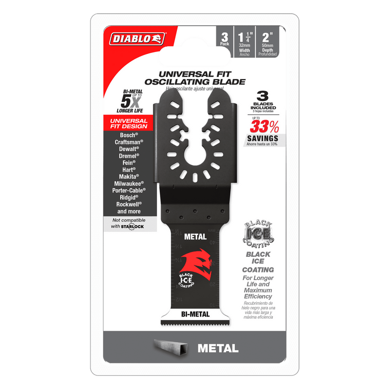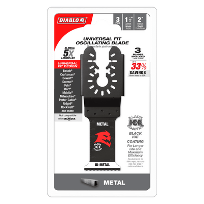 Diablo's universal fit bi-metal oscillating blades feature application specific designs that deliver maximum durability and longer life in metal. These high-performance blades feature an ultra-hardened cutting edge to deliver up to 5X longer life than standard blades. An optimized tooth design reduces vibration for fast and clean cuts. Black I.C.E. (Industrial Cooling Element) keeps the teeth cool and build up free for fast, clean cuts. The blade's universal fit, adapter-free design easily attaches most tools, with the exception of Starlock tools.