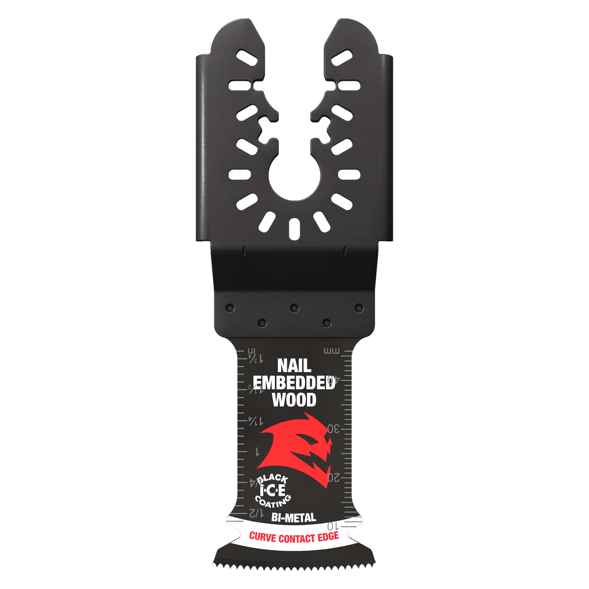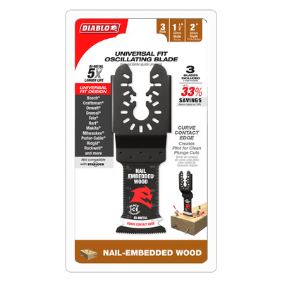 Diablo's universal fit bi-metal oscillating blades feature application specific designs that deliver maximum durability and longer life in nail-embedded wood applications. These high-performance blades feature an ultra-hardened cutting edge to deliver up to 5X longer life than standard blades. Curve contact edge creates a pilot for precise, clean plunge cuts with less vibration. Black I.C.E. (Industrial Cooling Element) keeps the teeth cool and build up free for fast, clean cuts. The blade's universal fit, adapter-free design easily attaches most tools, with the exception of Starlock tools.