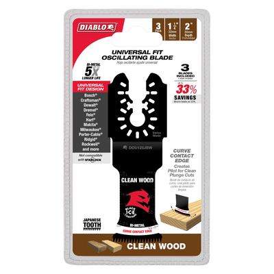 Diablo's universal fit bi-metal oscillating blades feature application specific designs that deliver maximum durability and longer life in clean wood applications. These high-performance blades feature an ultra-hardened cutting edge to deliver up to 5X longer life than standard blades. Curve contact edge creates a pilot for precise, clean plunge cuts with less vibration. An optimized Japanese tooth design and Black I.C.E. (Industrial Cooling Element) keeps the teeth cool and build up free for fast, clean cuts. The blade's universal fit, adapter-free design easily attaches most tools, with the exception of Starlock tools.