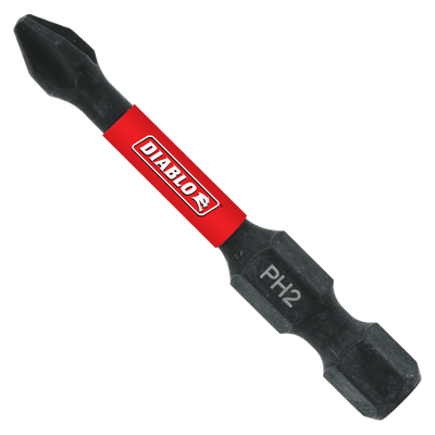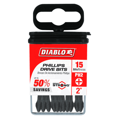 Diablo's driver bit range of Phillips bits delivers maximum performance, extreme durability and up to 50x longer life when installing and removing fasteners. An optimized tip design provides a strong, precise grip that reduces wear, stripping and slippage. Torque Resistant Design absorbs torque for less stress at the tip when tightening and removing nuts and screws. This range is Impact Strong, delivering increased shank stability and durability in cordless and corded impact and drill drivers.
