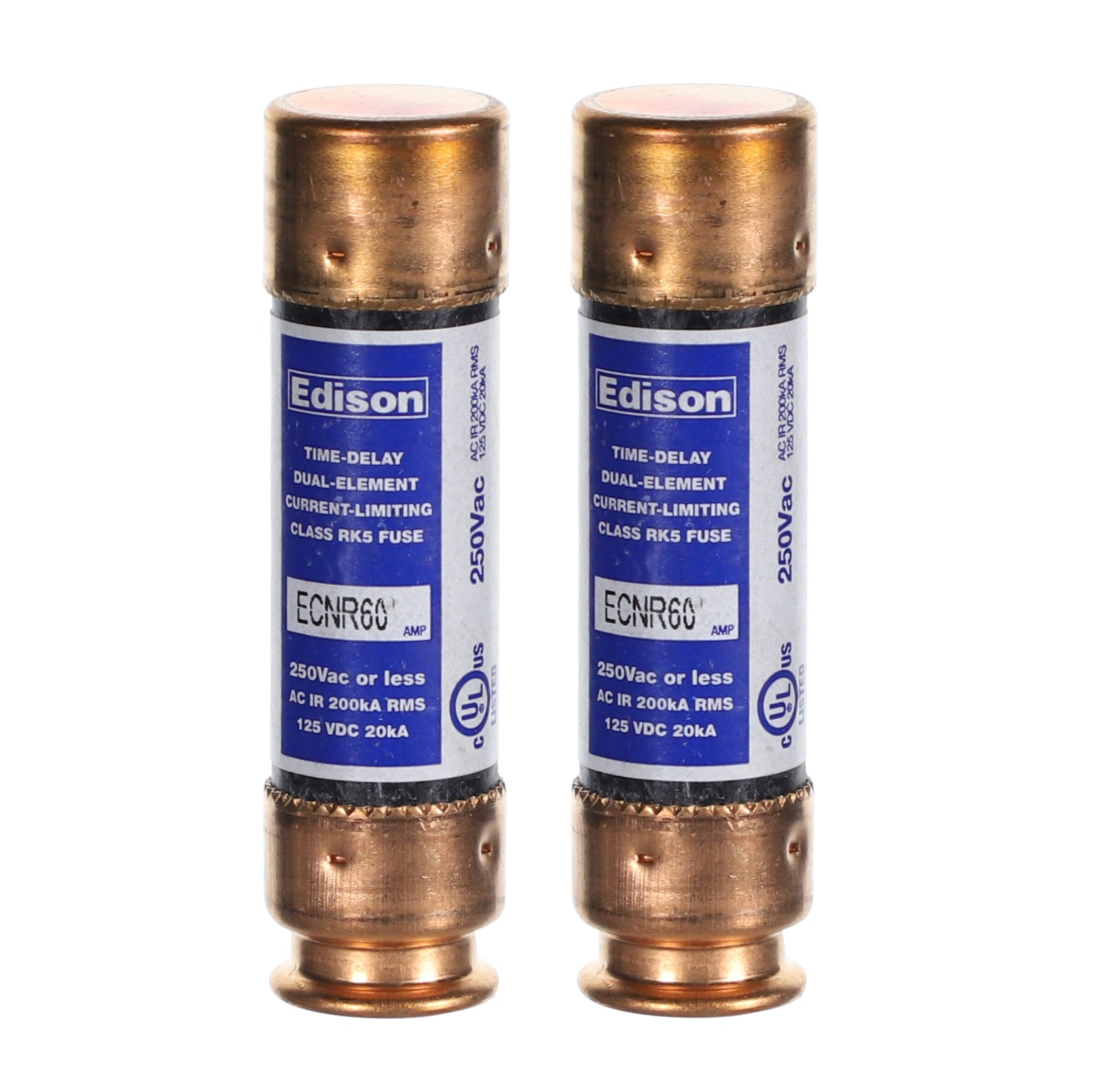 The Devco ED-CR60 Dual element fuse, 60 Amps, pack of 2 provides time delay for temporary over-current conditions and motor running protection for heating and air conditioning equipment. U.L. Class RK-5, Standard for Safety 198E, Current Limiting Fuses, Interrupting Rating 200,000 Amps. rms. A.C.Eliminates unnecessary maintenance from harmless overloads. This product was made by DiversiTech for the DiversiTech branded items.