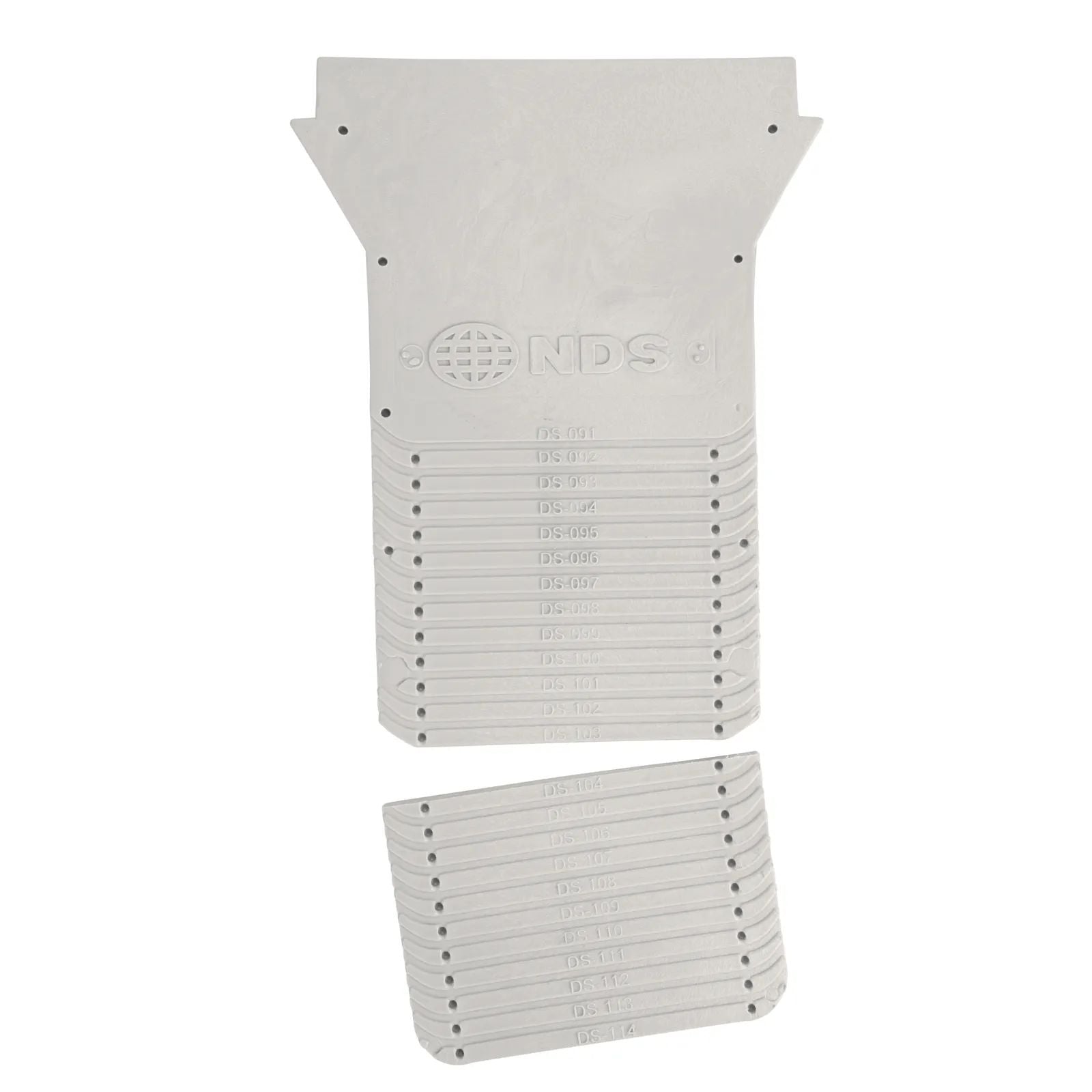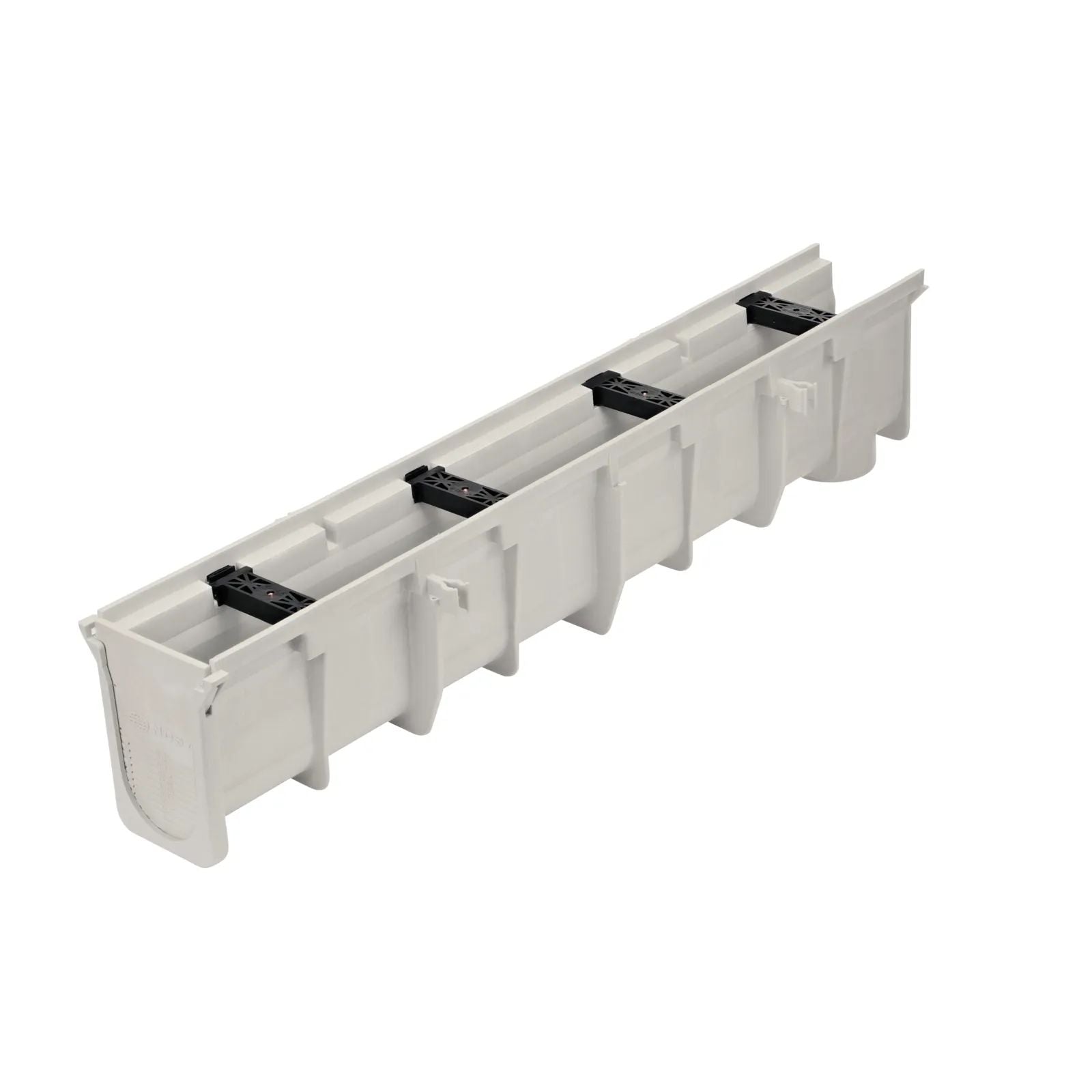 NDS Dura Slope is a 6 5/8" wide, 48" long trench drain system with a built-in slope of 0.7%. "N" sections are non-sloped and used to extend the length of the system. Each channel section is molded of gray structural foam polyethylene with UV inhibitors 4" inside diameter with a 2" radius bottom. LeveLoc re-bar supports with integral protruding knob levels channel and grips re-bar. ProFit locking system locks grate to integral frame and supports product during installation DuraLoc integral joint lock prevents joint movement during installation, no extra clamps or screws needed. Interlocking tongue and groove joints and bottom outlet on each channel section 0.7% built-in slope.