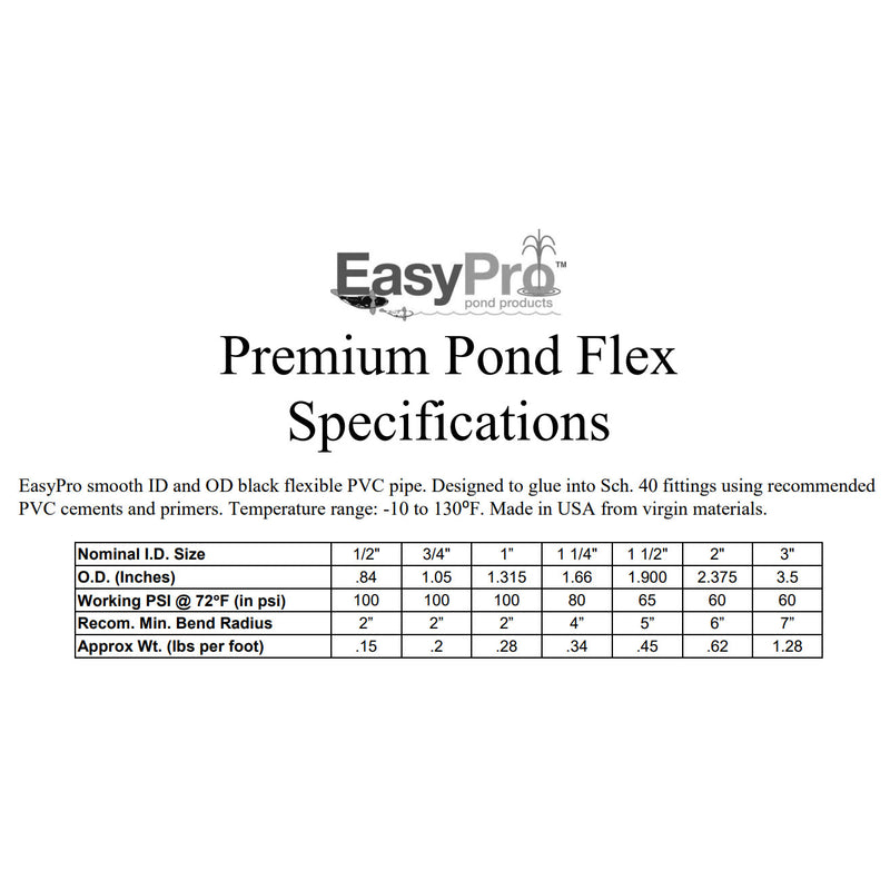 EasyPro Premium Pond Flex PVC pipe is made in the USA from virgin materials ensuring the highest quality. This pipe offers a quality alternative to Ultimate Pond Flex Tubing at an affordable price. This black flex PVC pipe is very flexible and has excellent strength making it a great choice for pond and water feature use.