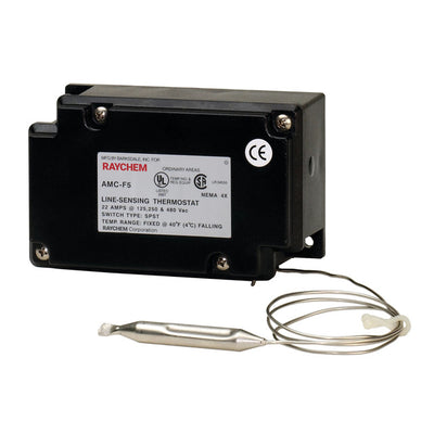 nVent RAYCHEM AMC-F5 is a thermostat for pipe freeze protection heat tracing applications in non-hazardous locations. It has a fixed set point of 40 °F/5 °C, used in either ambient or surface sensing modes, it can control a single heat tracing circuit or switch multiple circuits through a contactor.