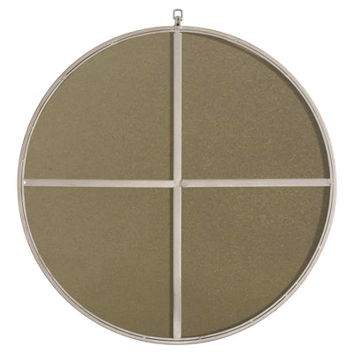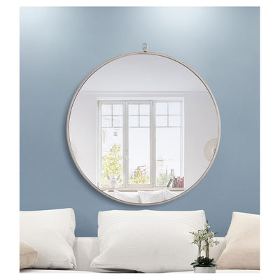 Enhance the appeal of your home or office with this contemporary mirror inSilver finish, slightly antiqued, featuring a thin rounded metal edges in a deep profile, reflecting a minimalist's design and trendy styling. To ensure your home safety, we use a metal hanger ring that are securely welded to the back of the metal frame , which sit on top of the frame for easy hanging. We recommend using suitable heavy duty picture/mirror hooks, selecting the best type of fixing for the particular wall you wish to hang the mirror on, using the appropriate rawl plug if required. Measurement: D32.