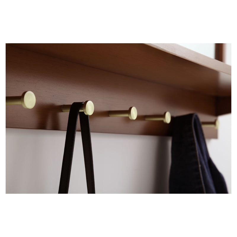 Our Elle mirror makes a welcoming statement in the entryway and foyer of your home. This mirror is simple and stylish with its wooden frame underlined by a shelf with multiple brass pegs. Perfect for hanging handbags, hats, and scarves. The shelf is great for displaying decorative accents. Comes with two keyhole metal brackets for easy installation.