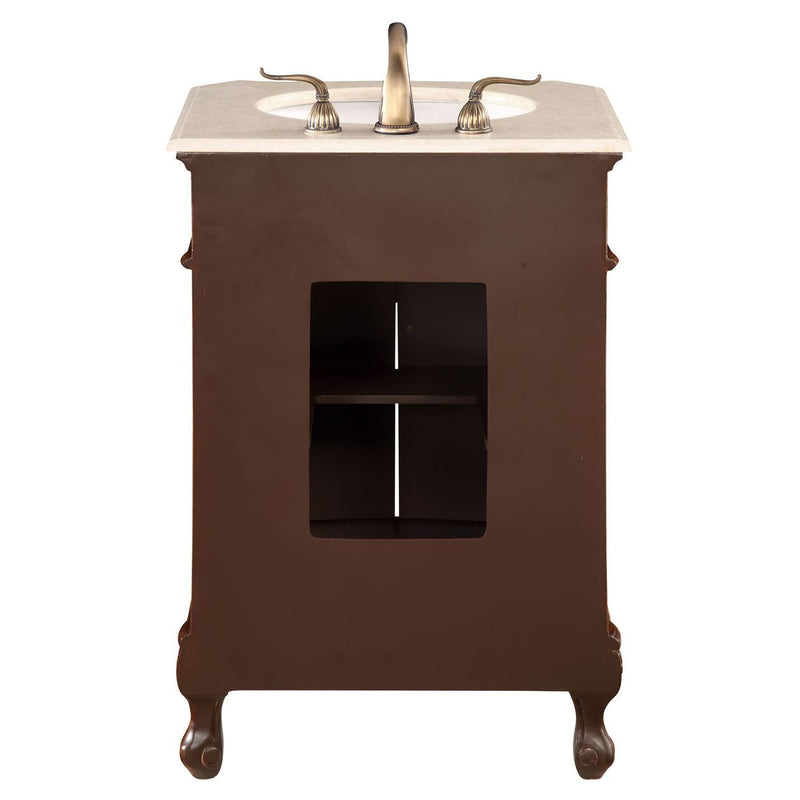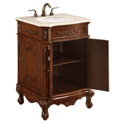 - This superb balance of timeless tradition and opulent beauty in a marble-topped 2 doors vanity will certainly enhance the aesthetics of any home or office bathroom! featuring an authentic cream marble countertop occasionally with light brown veining, complimenting the hand painted antique teakwood finish cabinet oval white porcelain under mount sink, a superbly carved floral design, stylishly carved solid wood french scroll feet, as well as antique bronze finish door knobs. a truly rich statement of luxury! measurements: w24 x d21 x h36.
