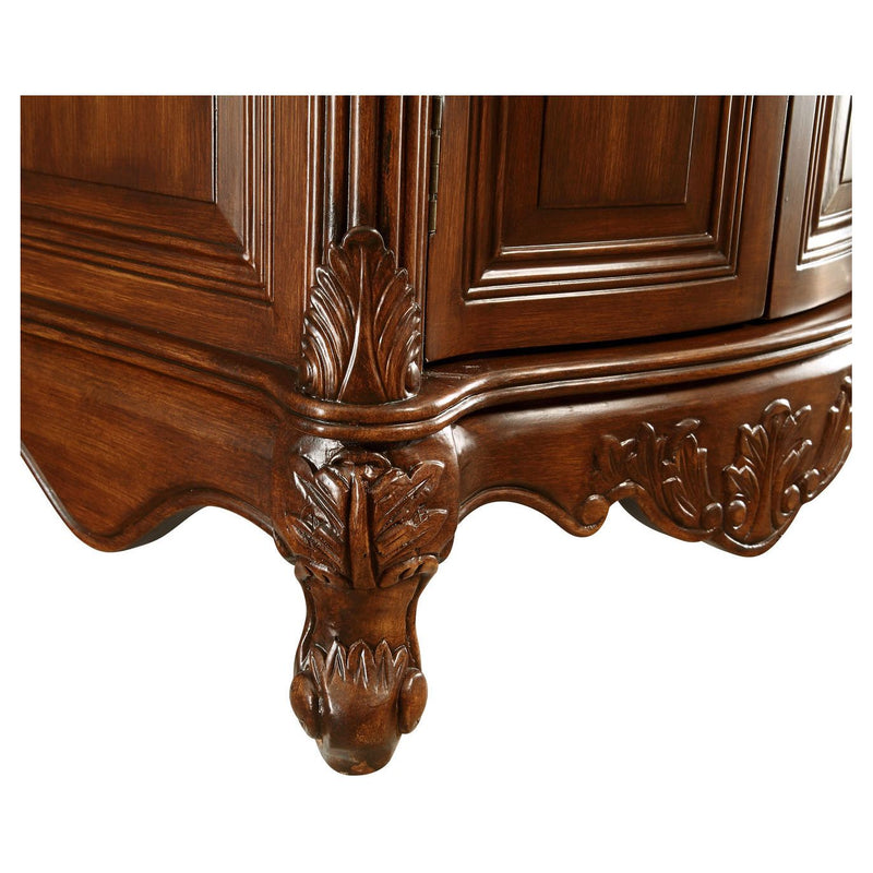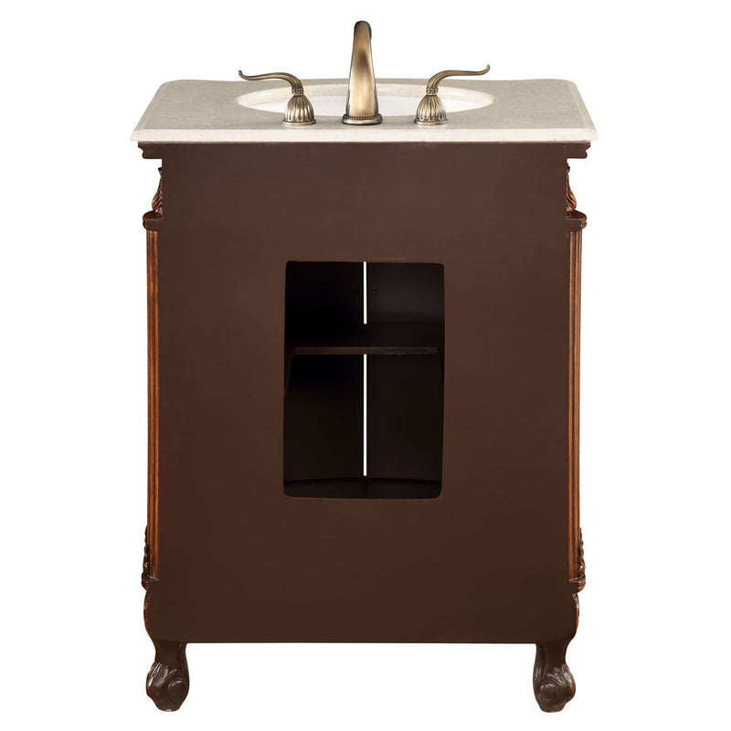 - This classic look from our distinctive danville line of marble top vanities features stately, time-honored styling and would certainly enhance any home or office bathroom! includes an authentic cream marble countertop, oval white porcelain under mount sink, a hand painted teak finish cabinet with beautiful floral carving and elegantly carved solid wood legs, antique bronze finish knobs. combines outstanding design and timeless beauty! measurements: w27 x d21 x h36 authentic cream marble countertop pre-drilled faucet holes, 8 spread white porcelain under mount sink antique bronze finish door knobs 2 doors, 1 shelf inside constructed of kiln-dried solid wood and mdf faucets shown are not included. please note that due to the natural characteristics of the stone, the color and/or pattern of each countertop may vary from the pictures. no two slabs of marble are the same. comes completely assembled with expertly engineered packing