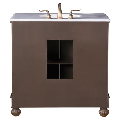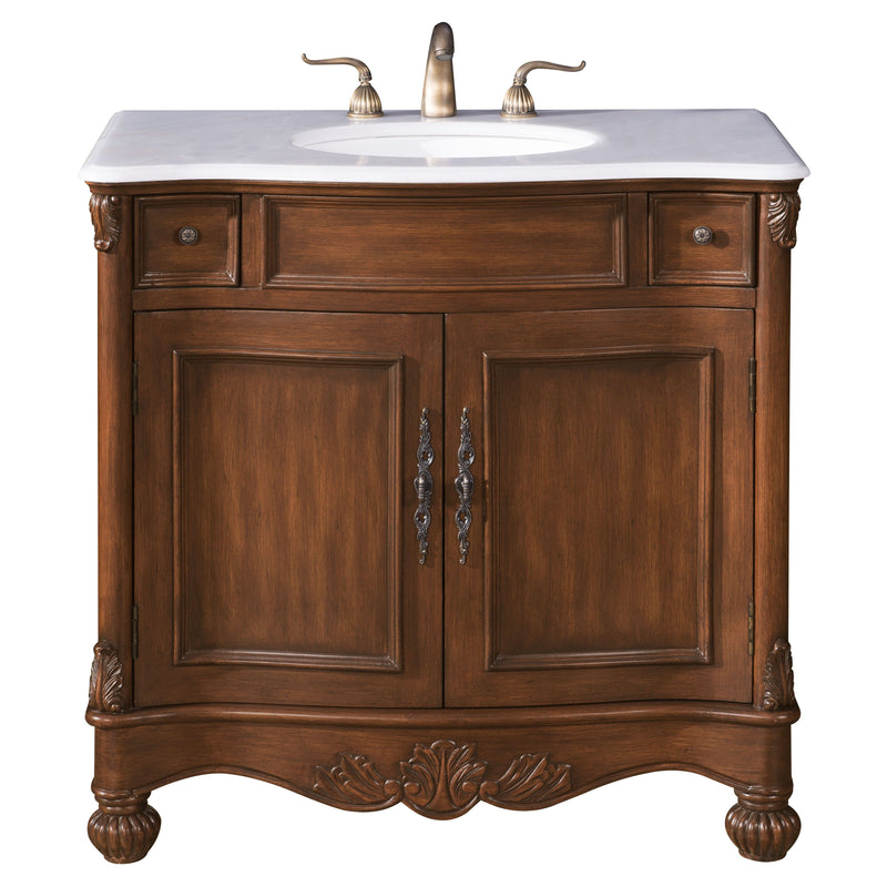 - With our Windsor line and its extraordinary sense of tradition, grace and charm, we offer this rare, medium-sized marble-topped vanity console that can also serve as a make-up table either way, it will bring remarkable beauty and class to your master bathroom or powder room. this stunning vanity features a wide and spacious authentic white marble countertop with light brown veining throughout the stone, complimenting the hand painted teak finish cabinet oval white porcelain undermount sink, ample legroom beneath the countertop (for use as a make-up table) and a hand painted teak finish cabinet, which combines a 1-door large storage space and a single wide drawer to store your more treasured bathroom essentials, with distinctive turned and carved bun feet, stylish floral carving and antique bronze finish knobs and drawer pulls. truly a masterpiece in every way!