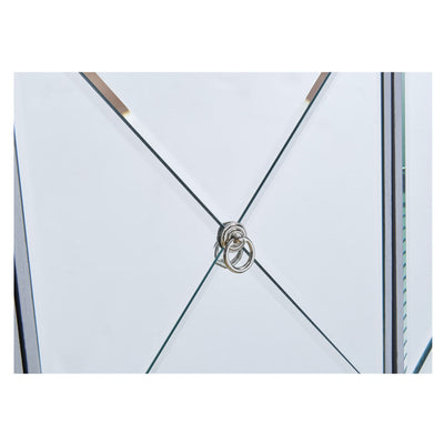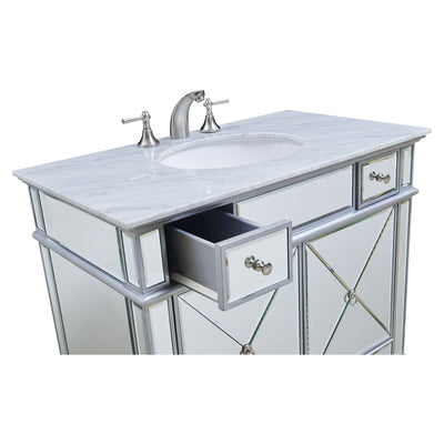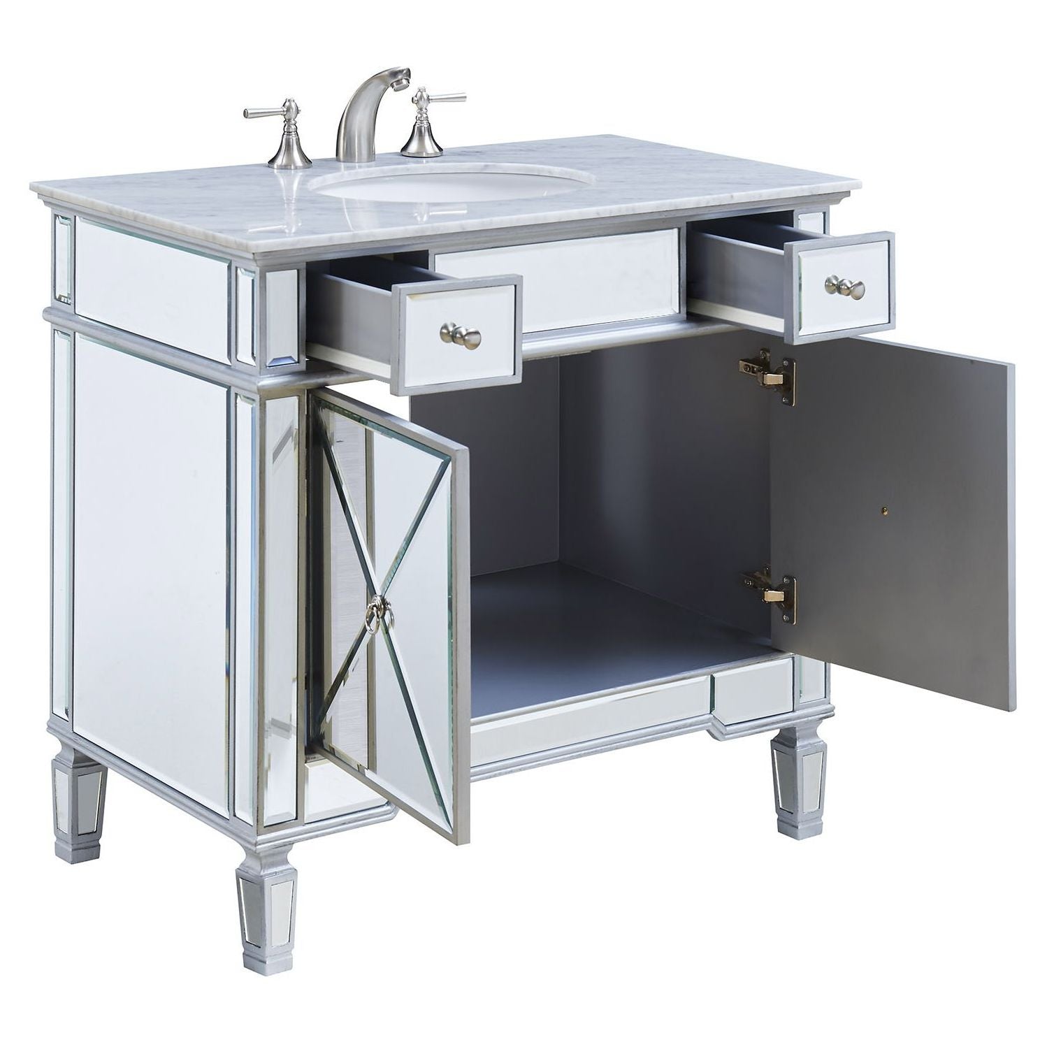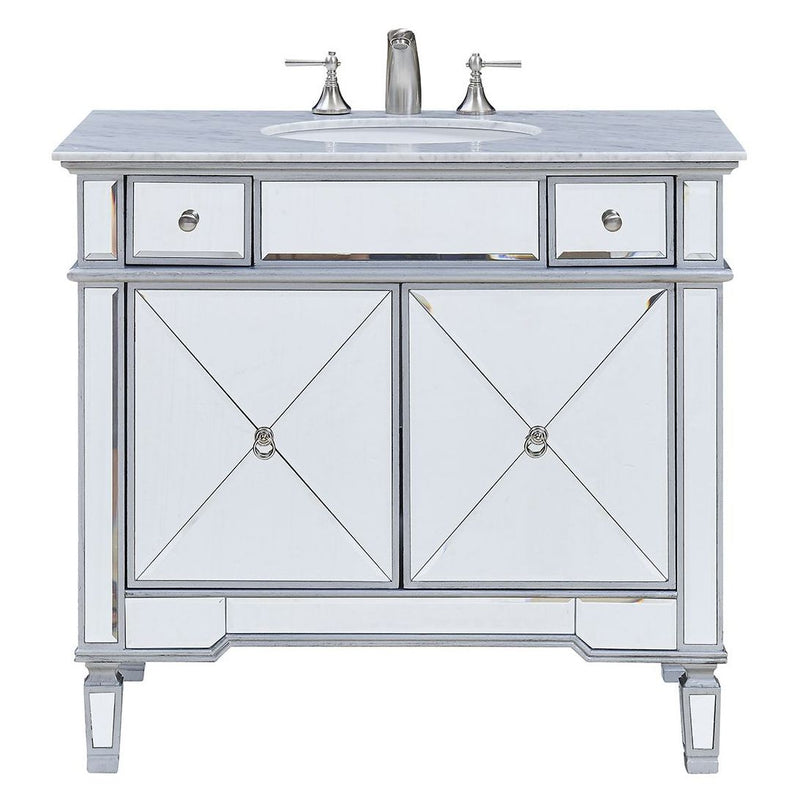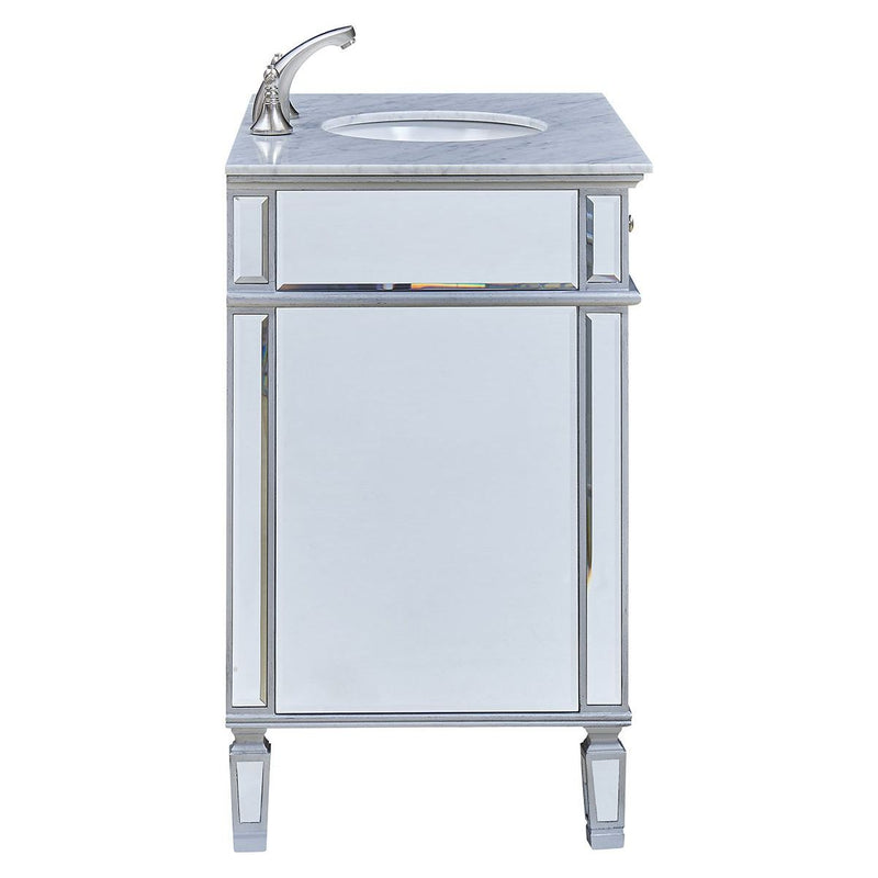 Beautiful vanity topping with an authentic carerra white marble imported from Italy, door decorated in crisscrossed mirror panels, hand-rubbed inSilver finish, brushed steel knobs and ring pull, this vanity will add a clean, sharp contemporary look and destine to please.