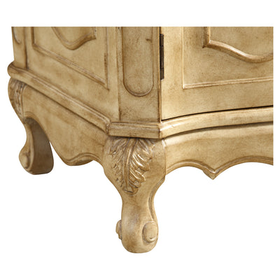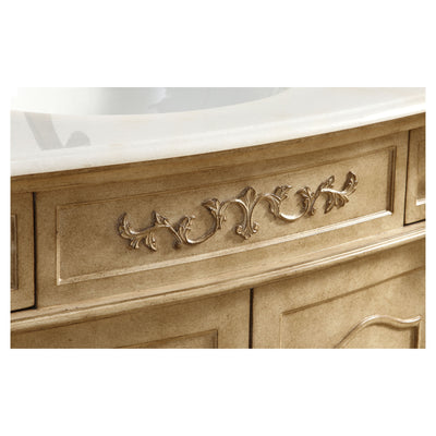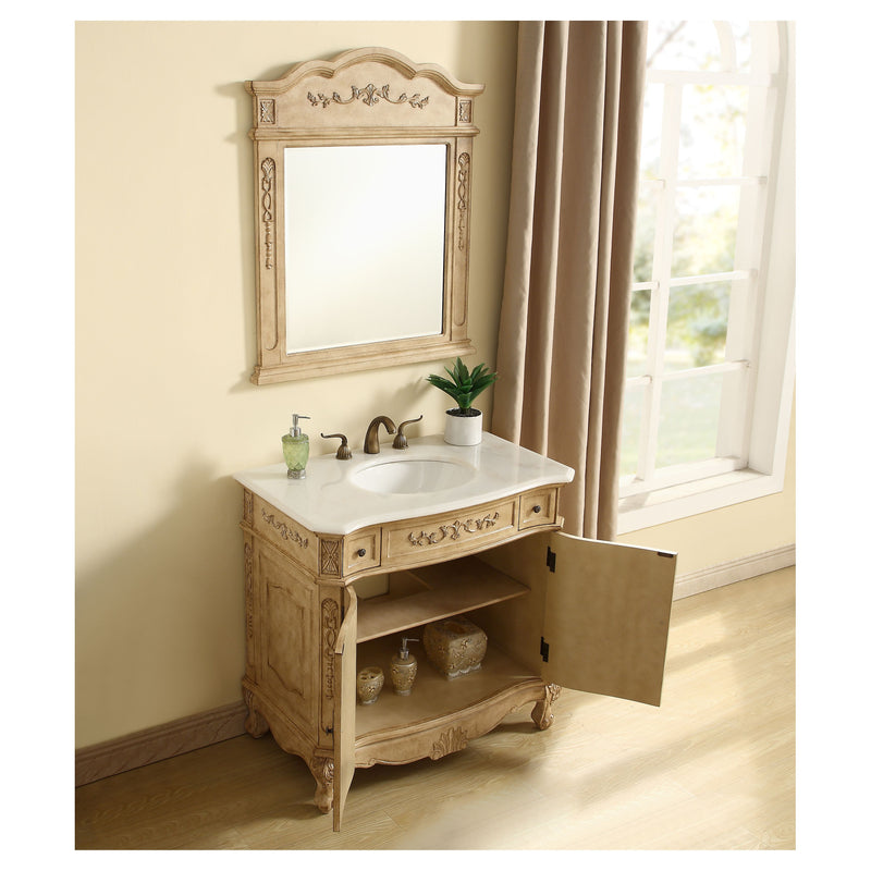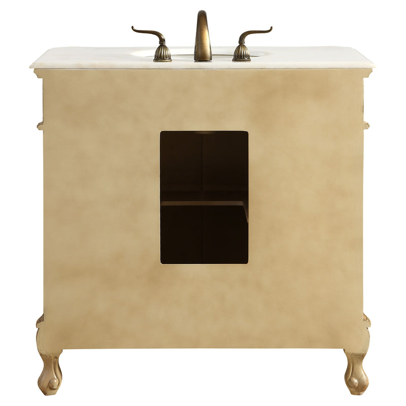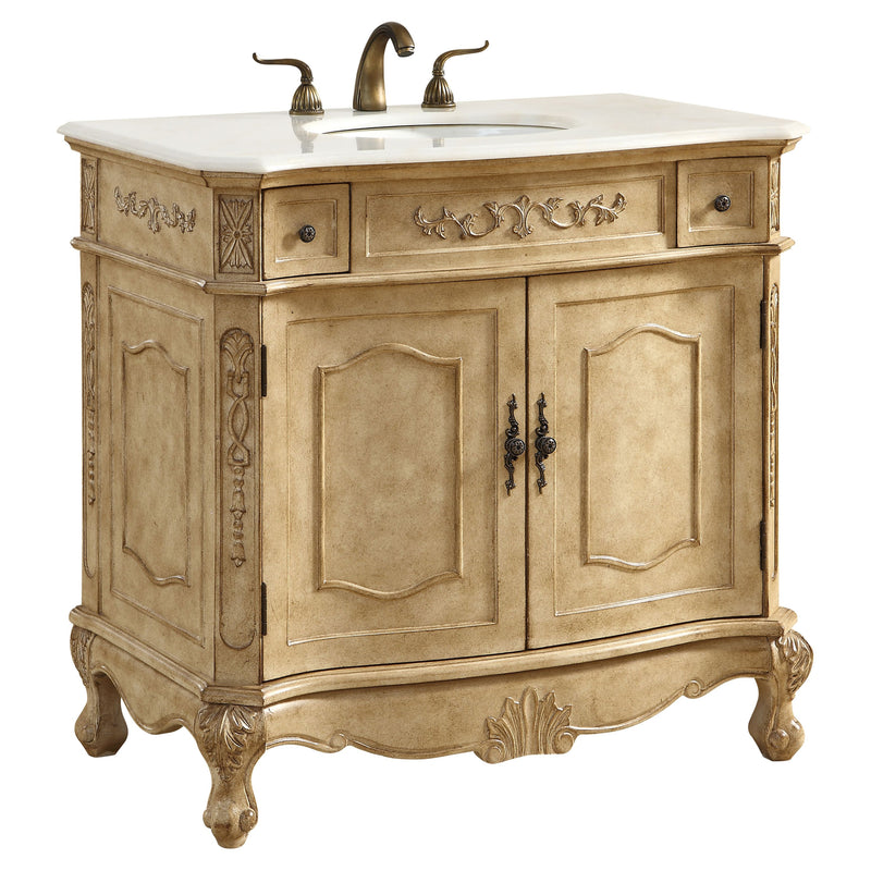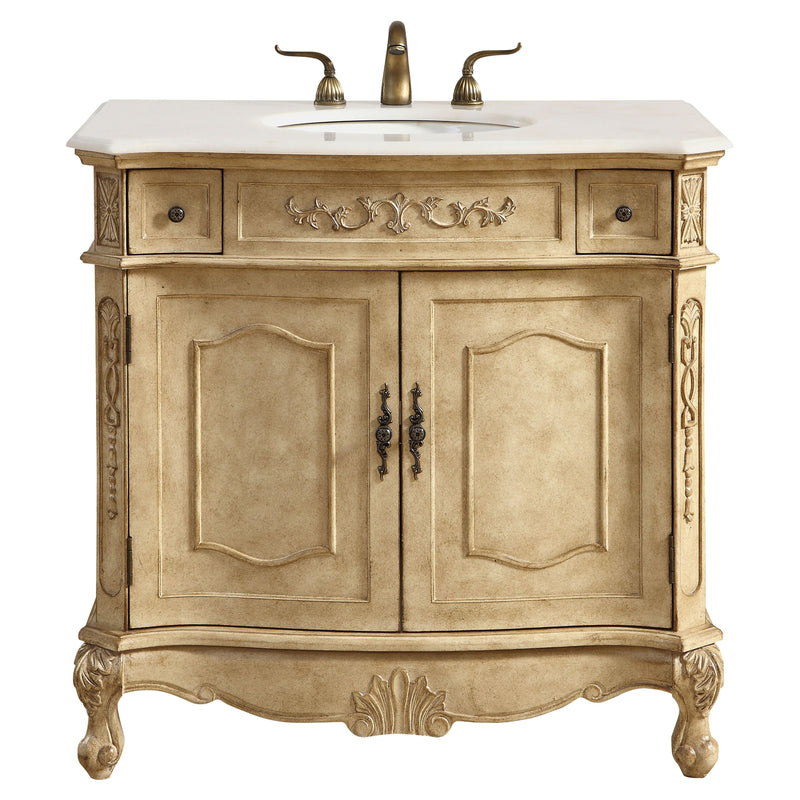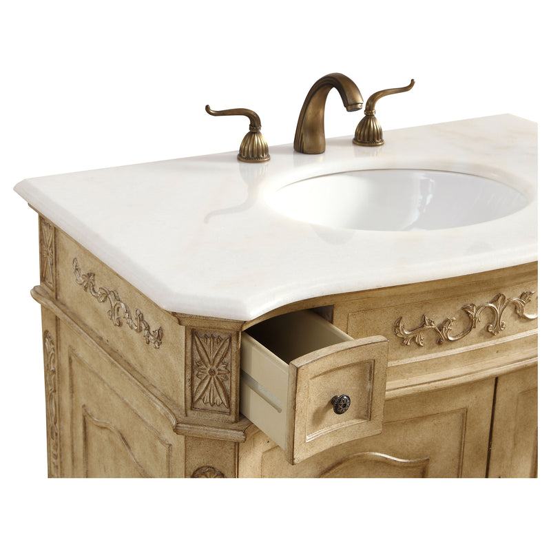 This superb balance of timeless tradition and opulent beauty in a marble-topped vanity will certainly enhance the aesthetics of any home or office bathroom! Featuring an authentic natural white marble countertop occasionally with light brown veining, complimenting the hand painted antique beige cabinet oval white porcelain under mount sink, 2 doors with a shelf inside, 2 side drawers, accented by antique bronze finish door knobs, a superbly carved floral design, stands on stylishly carved solid wood French scroll feet. A truly rich statement of luxury! Measurements: W36 x D21 x H35, fully assembled.