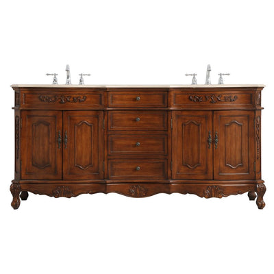 The Danville collection 72" vanity in a teak finish and double sink brings about traditional beauty. Decorated with ornate filigrees and engravings throughout, your bathroom or powder room will exude refined beauty. Don't let the design fool you, the antique bronze hardware allows you to discover storage spaces with ease. The simple knobs allows you to glide the 4 center drawers out, while the ornate knobs help you open the four cabinet doors. With two porcelain undermount sinks and ample cream marble countertop space, two people can get ready with ease and comfort. You and your guests will marvel at this vanity that will both store away your bathroom essentials and enhance the aesthetics of your room.