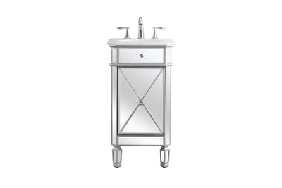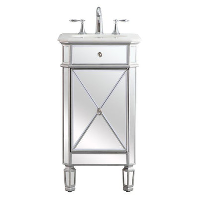Make a tasteful design statement in your bathroom from the 19" Camille Collection vanity with an authentic white marble top, occassionally in light brown veins. With a single door decorated in crisscrossed mirror panels, hand rubbedSilver finish, brushed steel knobs and ring pull, this vanity will add a clean, sharp contemporary look to your bathroom and destine to please. Measurements: W19"xD19"xH35".
