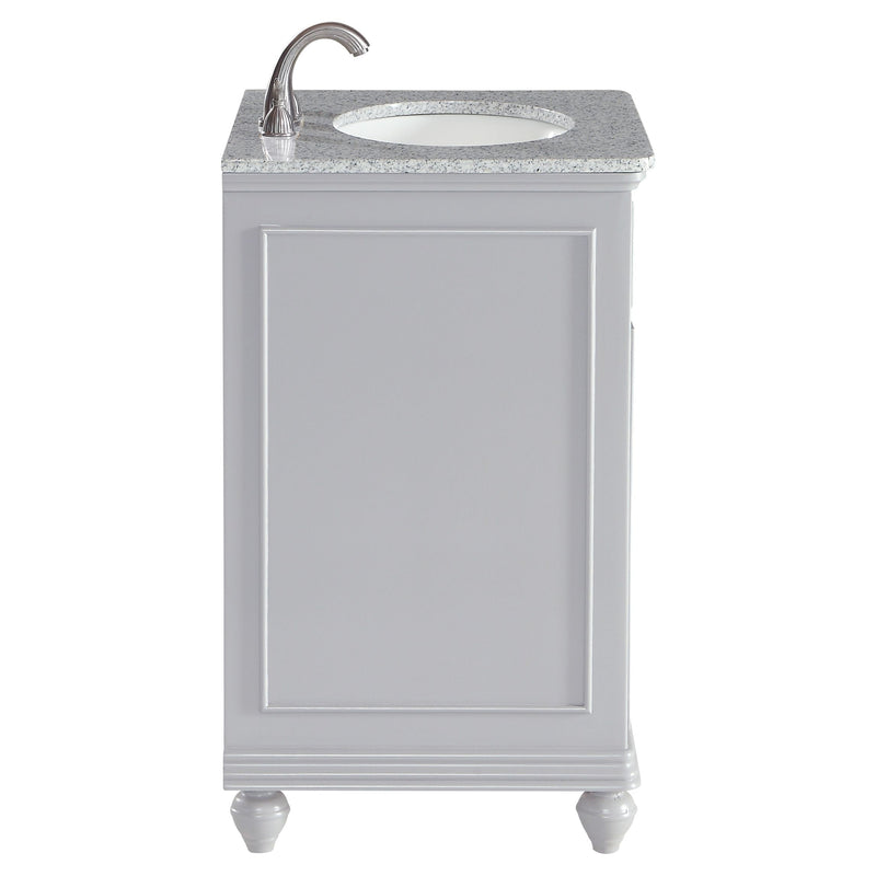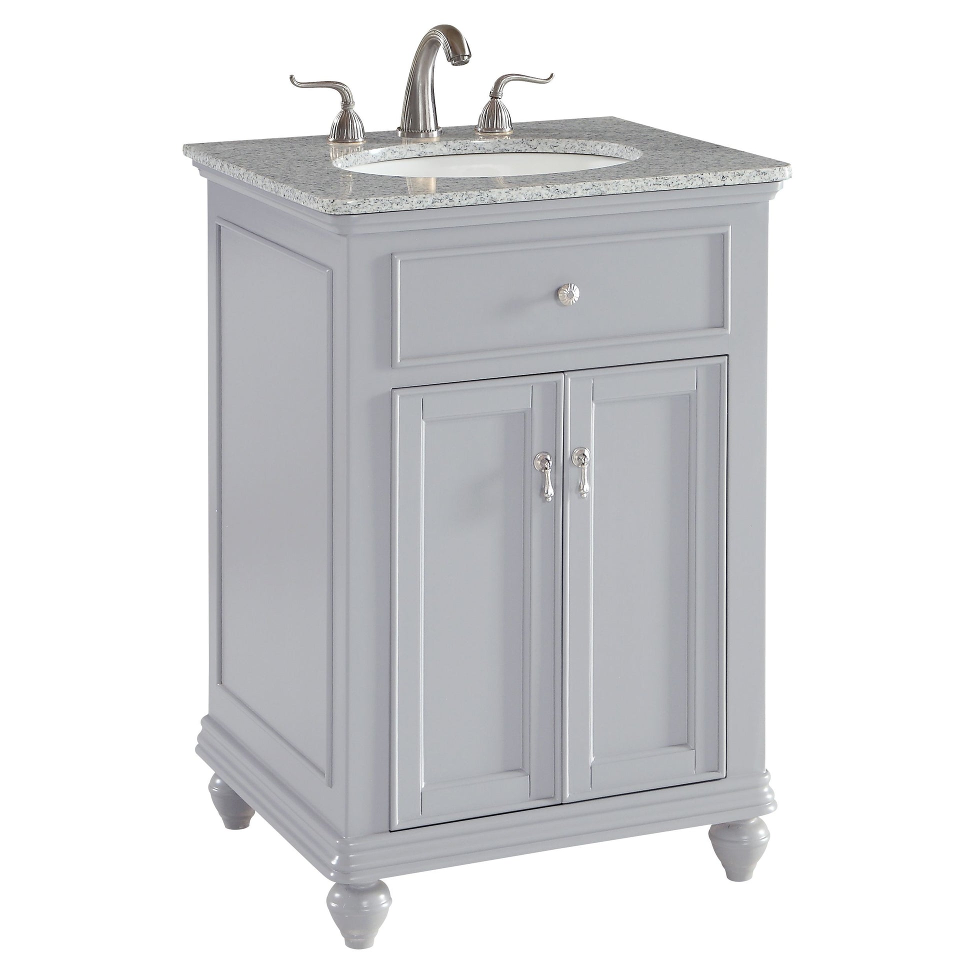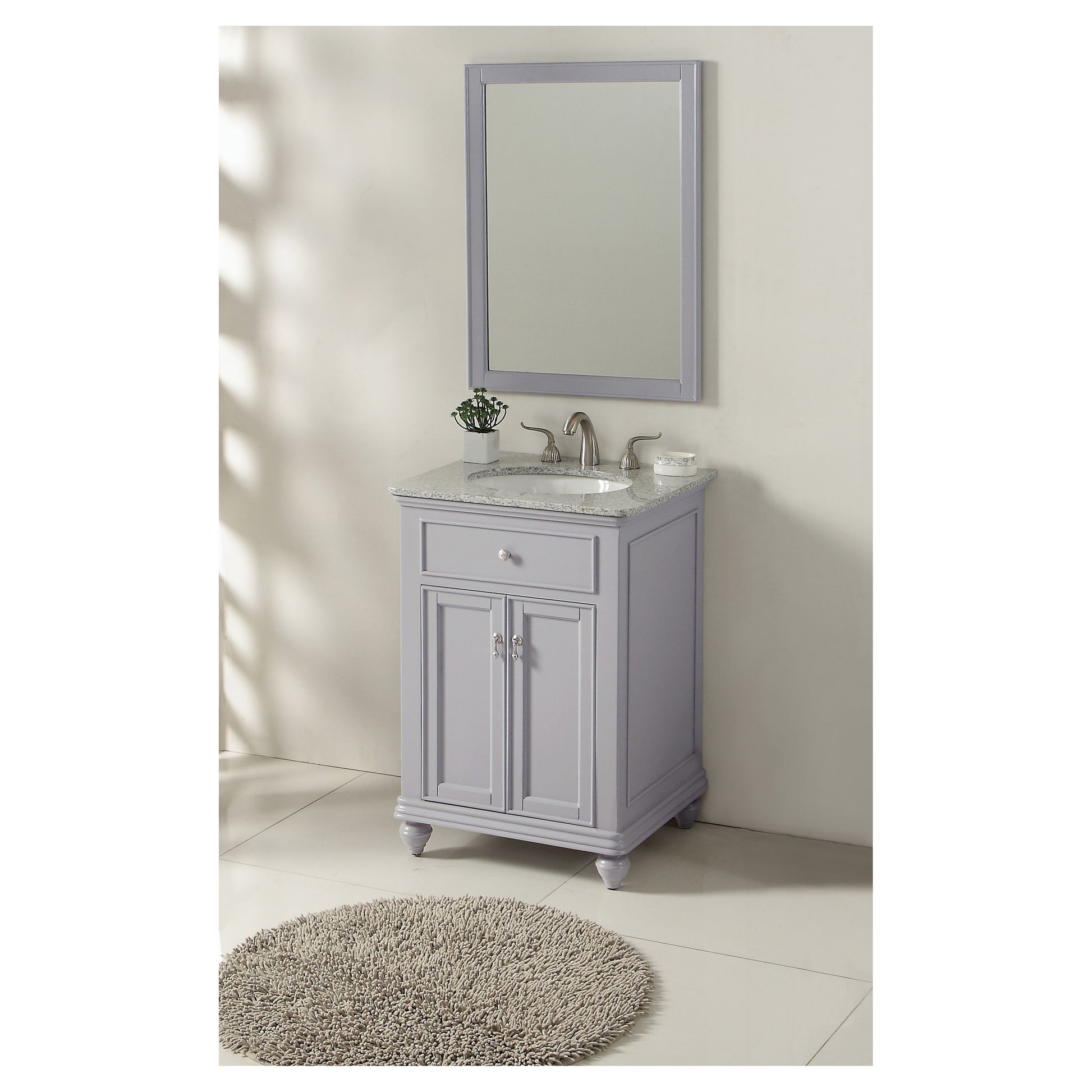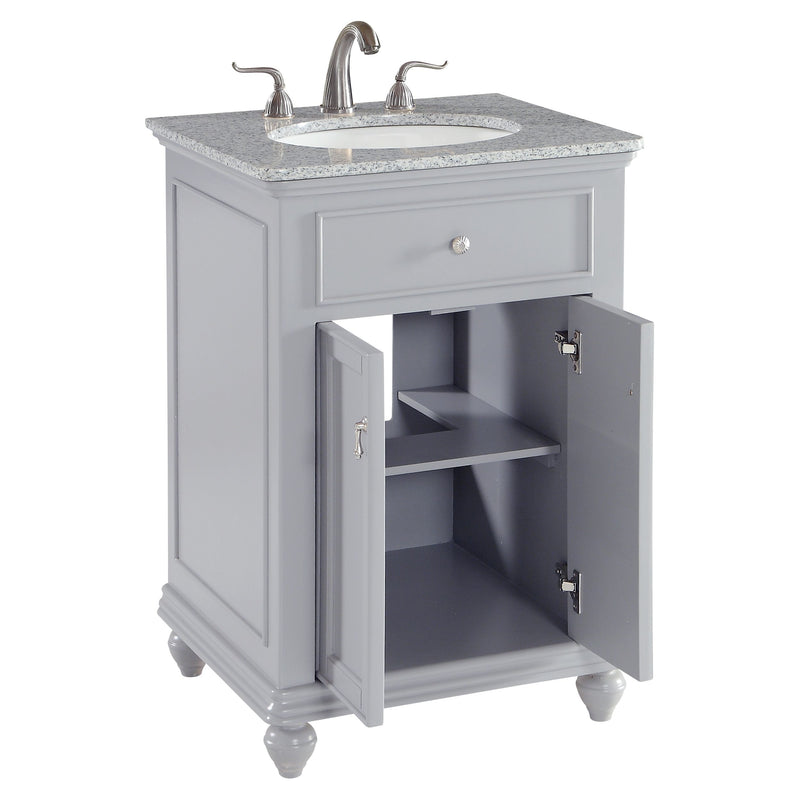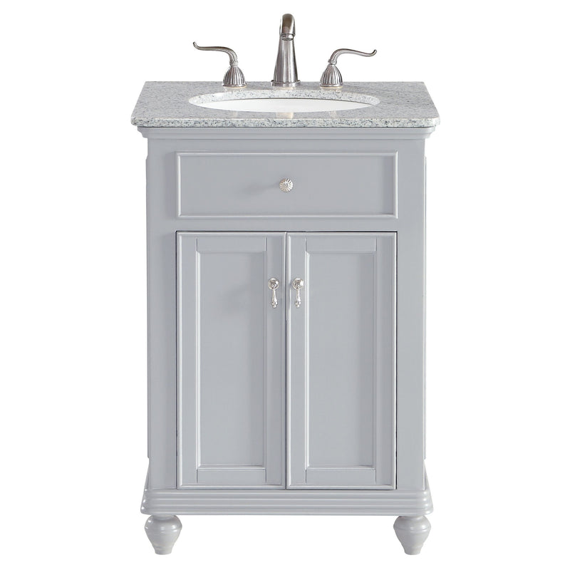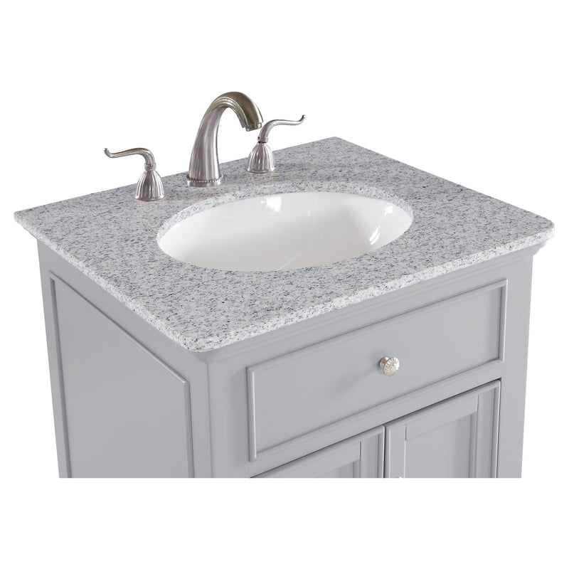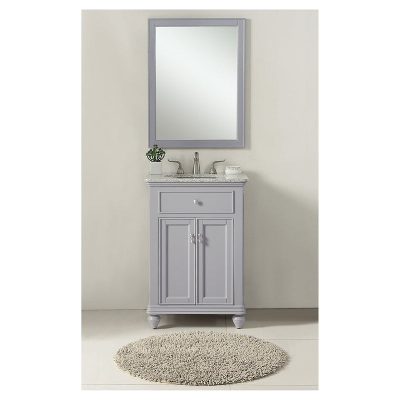 A sleekly styled 2 door, granite-topped bathroom vanity like this can only bring a smile of appreciation for its simple beauty and clean lines. With an authentic Kashmir white granite counter top, oval white porcelain sink, hand painted soft grey cabinet, 2 soft-close doors with a shelf inside, brushed steel hardware, carved bun feet, this elegant, transitional vanity balances form and function. Measurements: W24 x D21 x H35