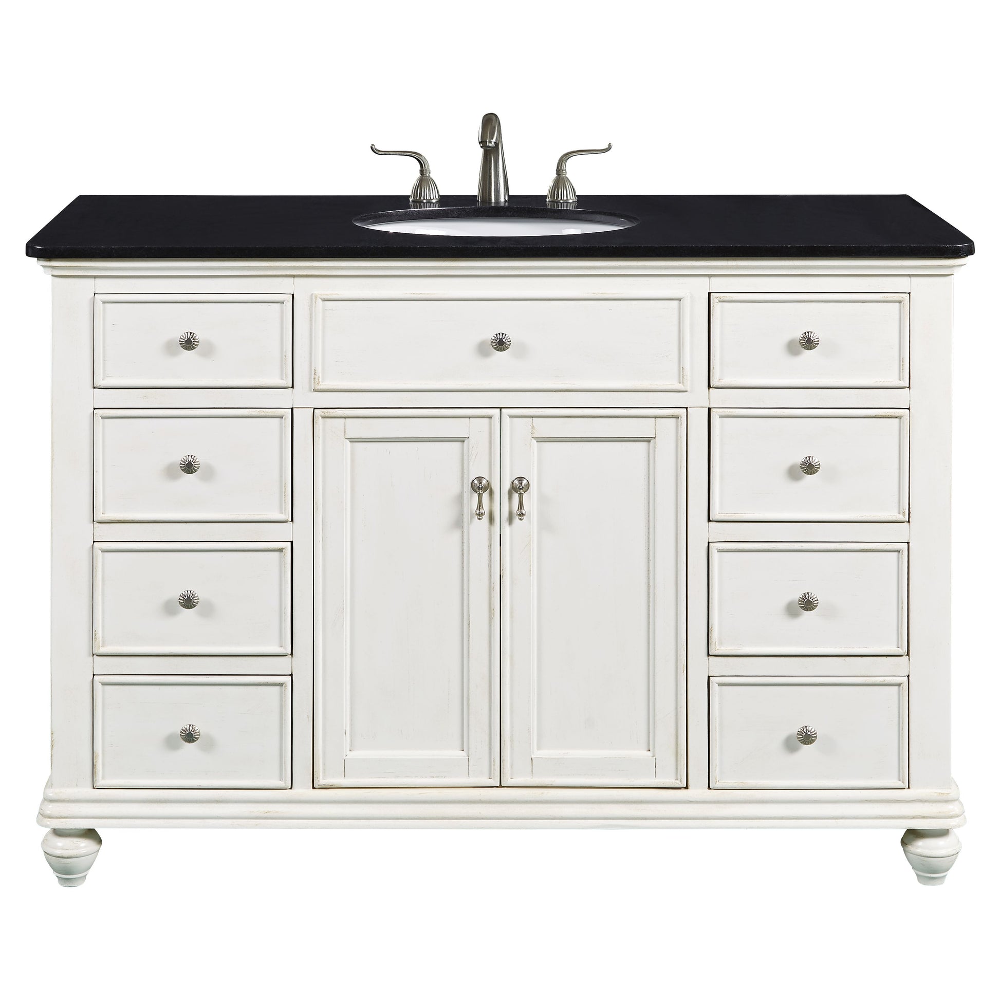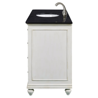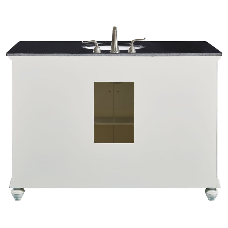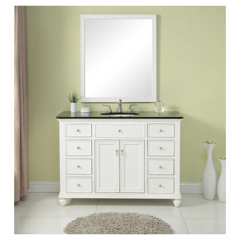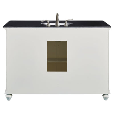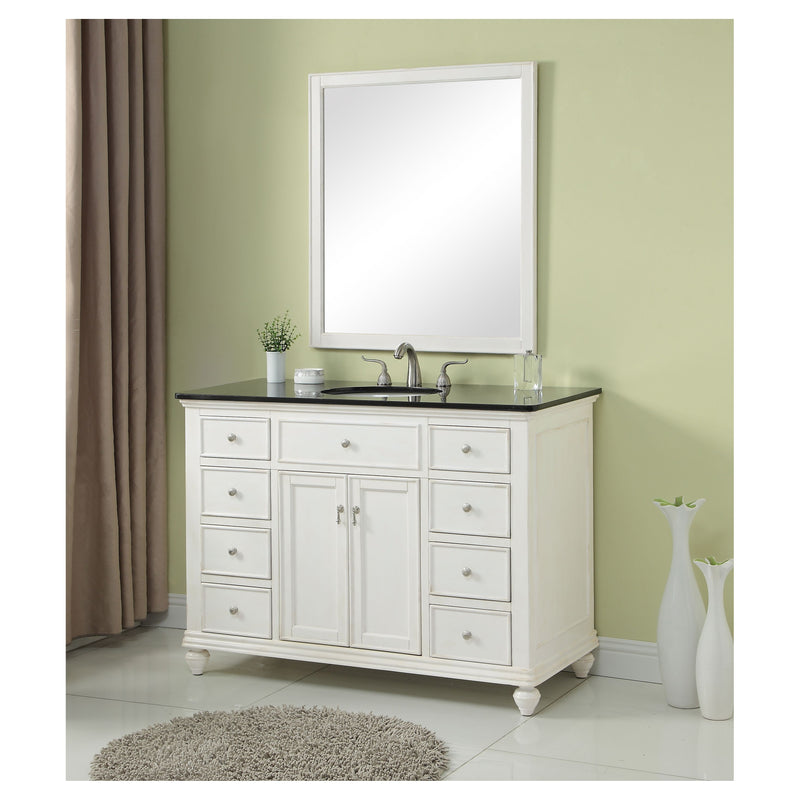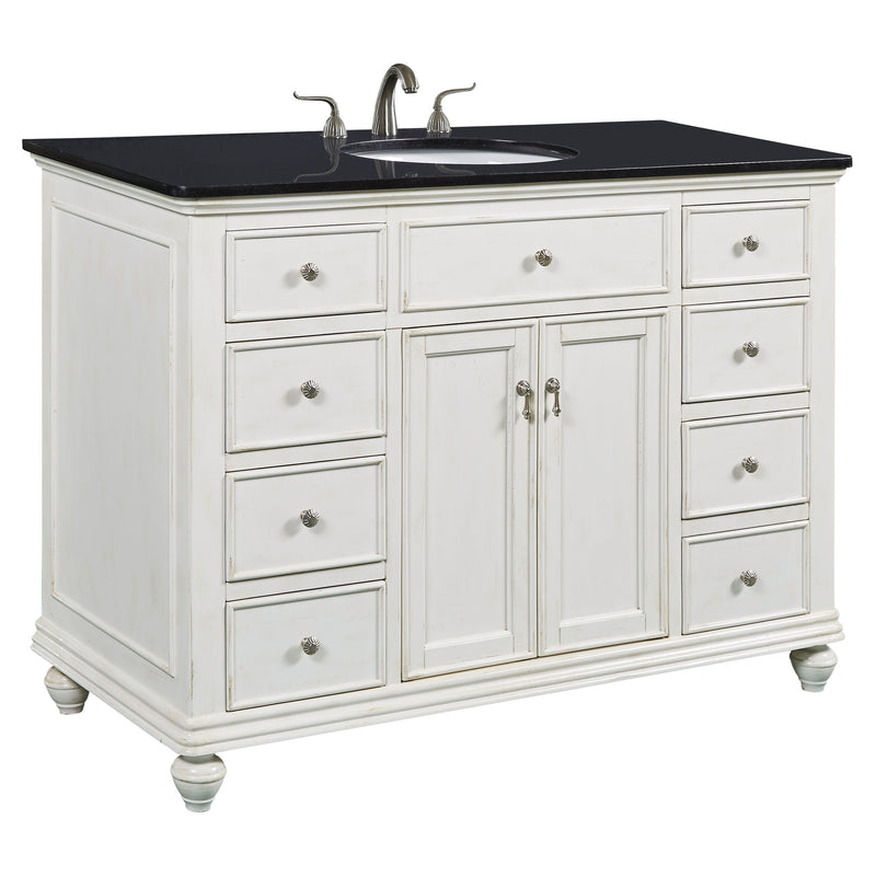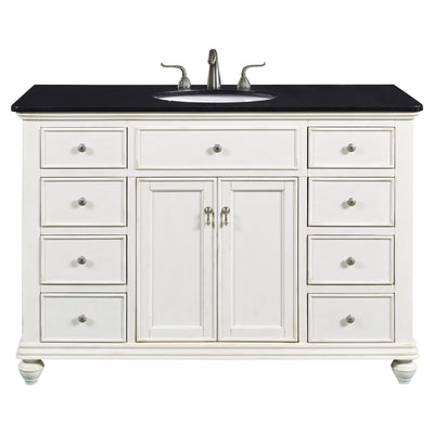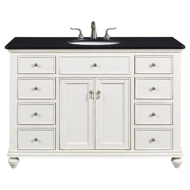 A sleekly styled 4 doors and 8 drawers, granite-topped bathroom vanity like this can only bring a smile of appreciation for its simple beauty and clean lines. With an authentic black granite counter top, oval white porcelain sink, hand painted antique white cabinet, 2 soft-close center doors with a shelf inside, 4 side drawers on each side, brushed steel hardware and carved bun feet, this elegant, transitional vanity balances form and function. Measurements: W48 x D21.5 x H35
