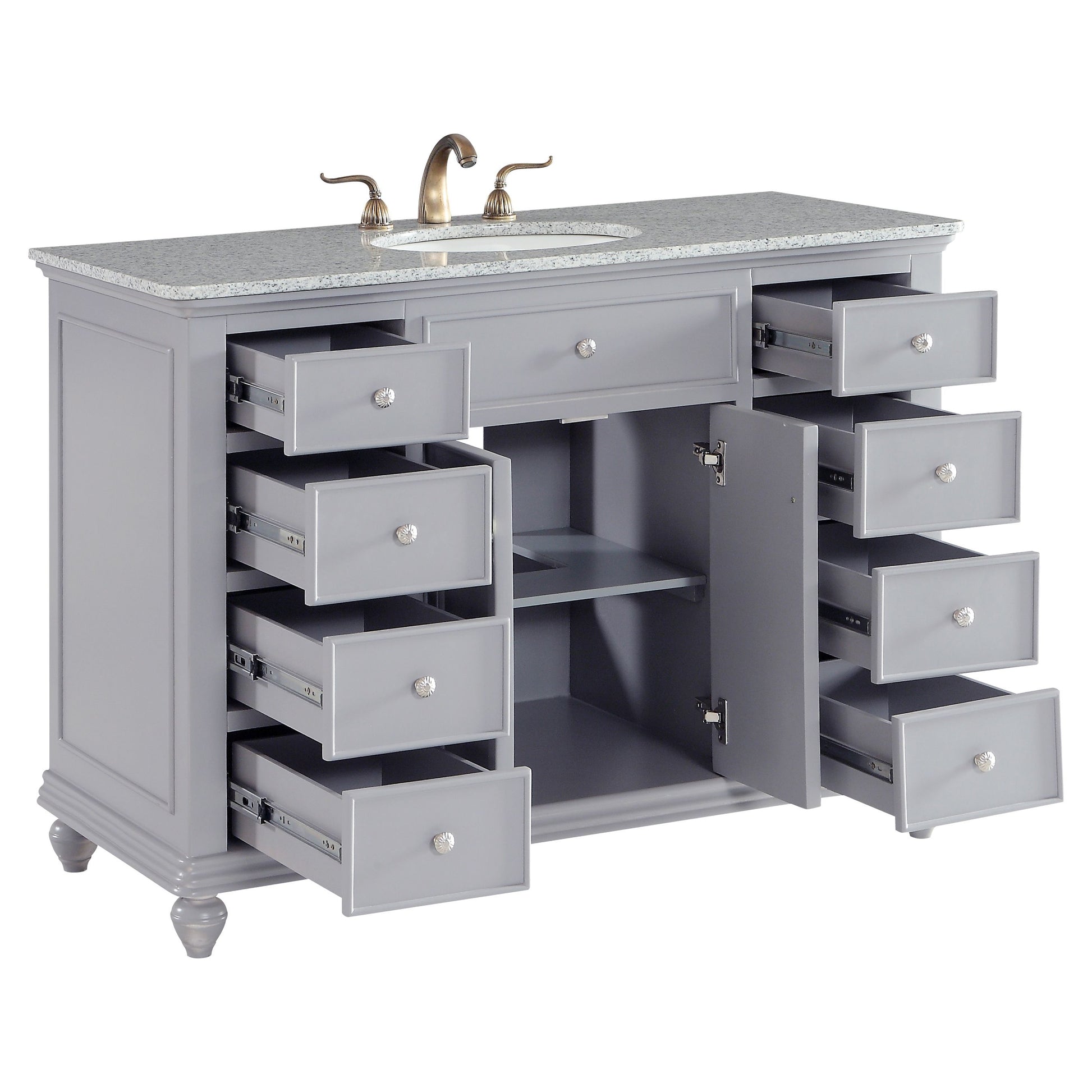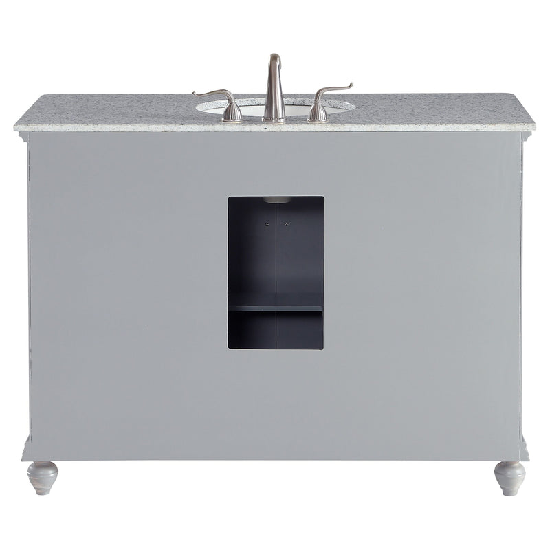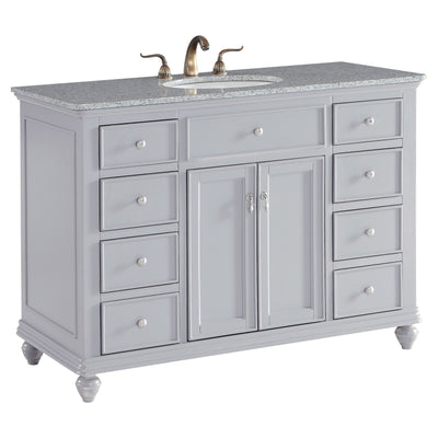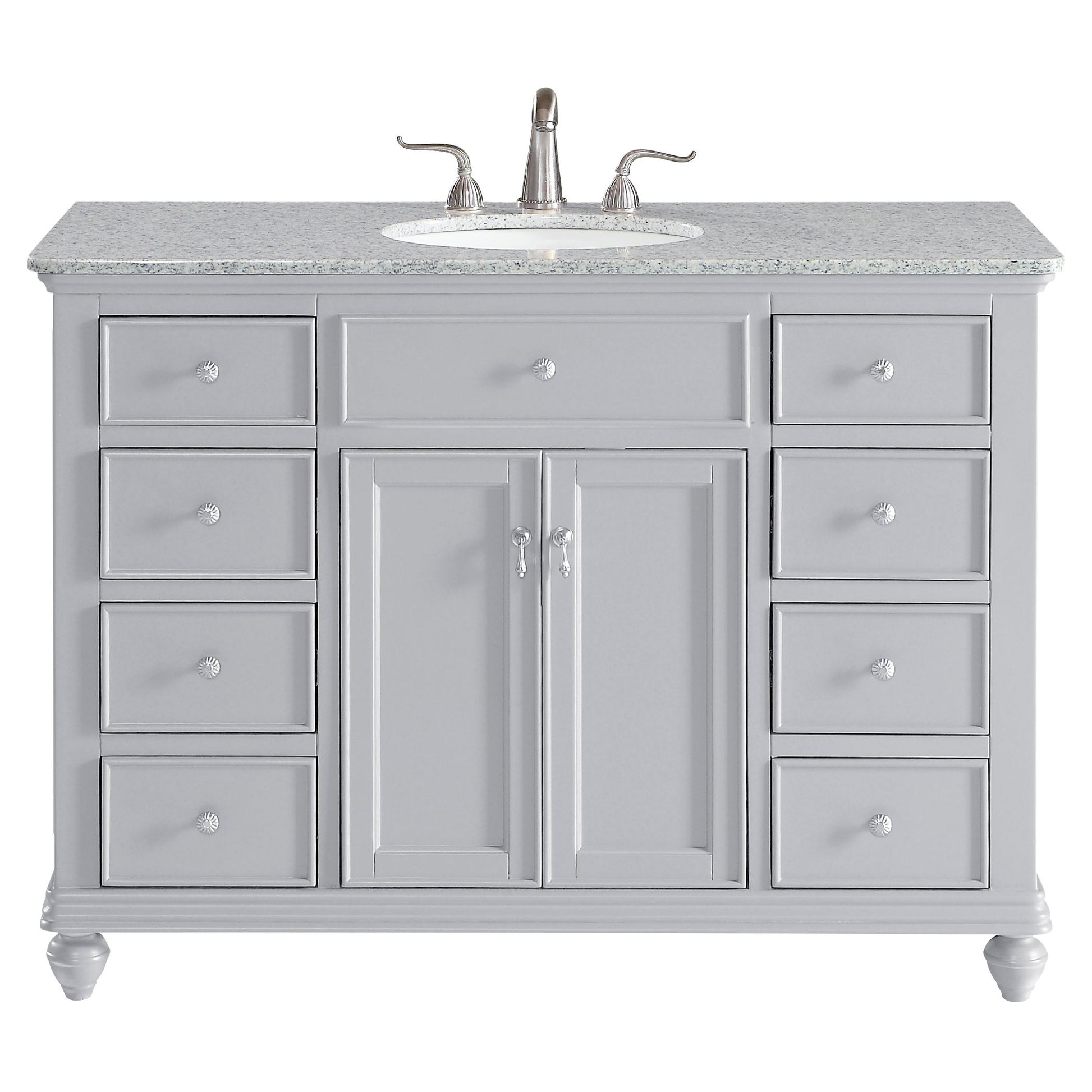 A sleekly styled 4 doors and 8 drawers, granite-topped bathroom vanity like this can only bring a smile of appreciation for its simple beauty and clean lines. With an authentic Kashmir white granite counter top, oval white porcelain sink, hand painted soft grey cabinet, 2 soft-close center doors with a shelf inside, 4 side drawers on each side, brushed steel hardware and carved bun feet, this elegant, transitional vanity balances form and function. Measurements: W48 x D21 x H35