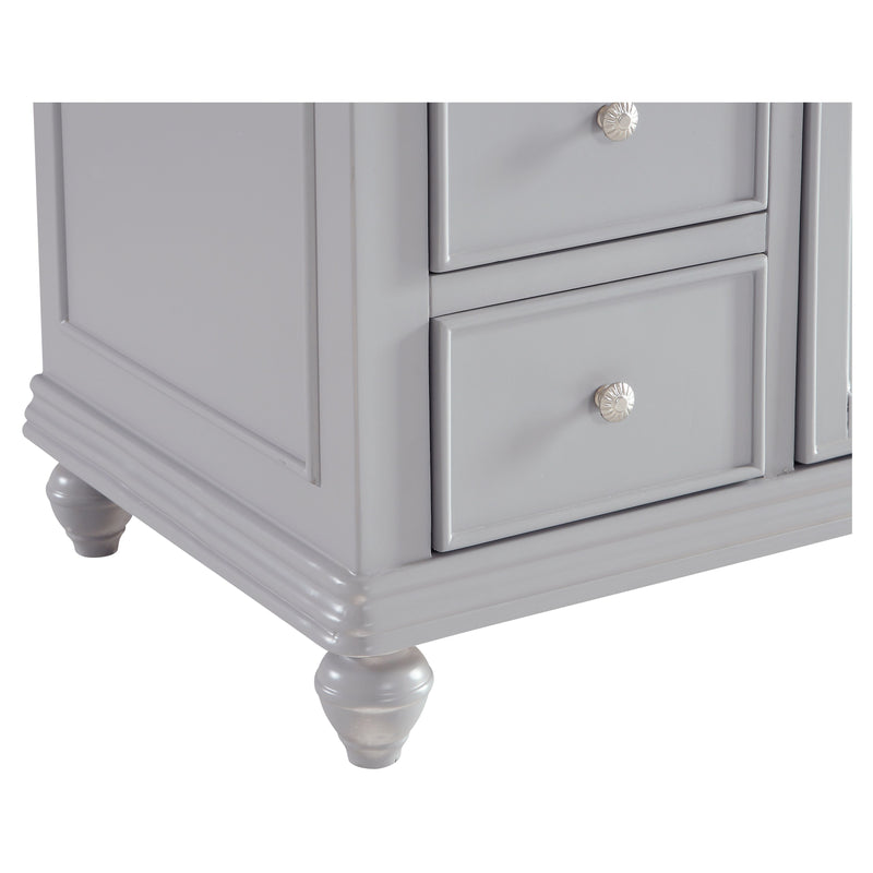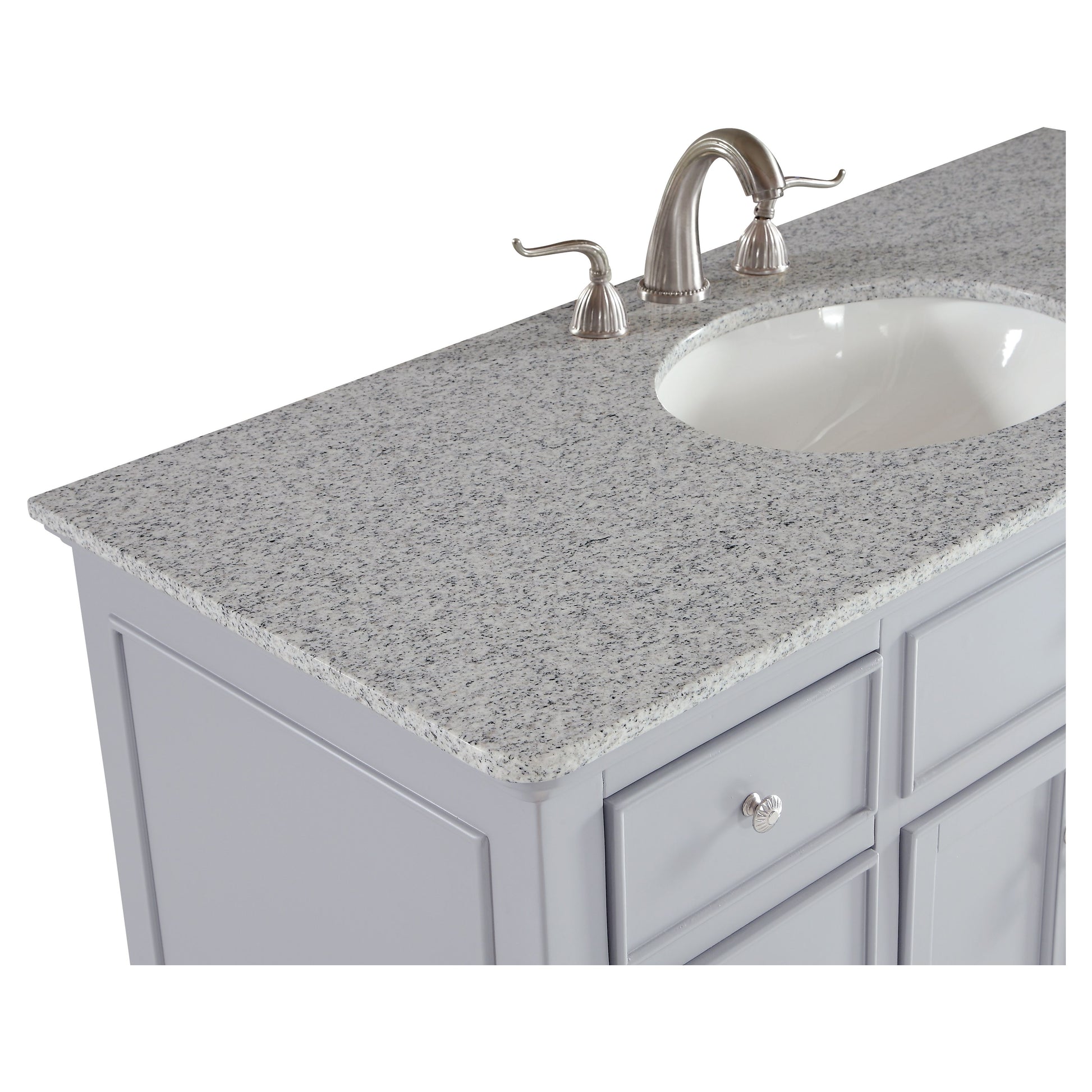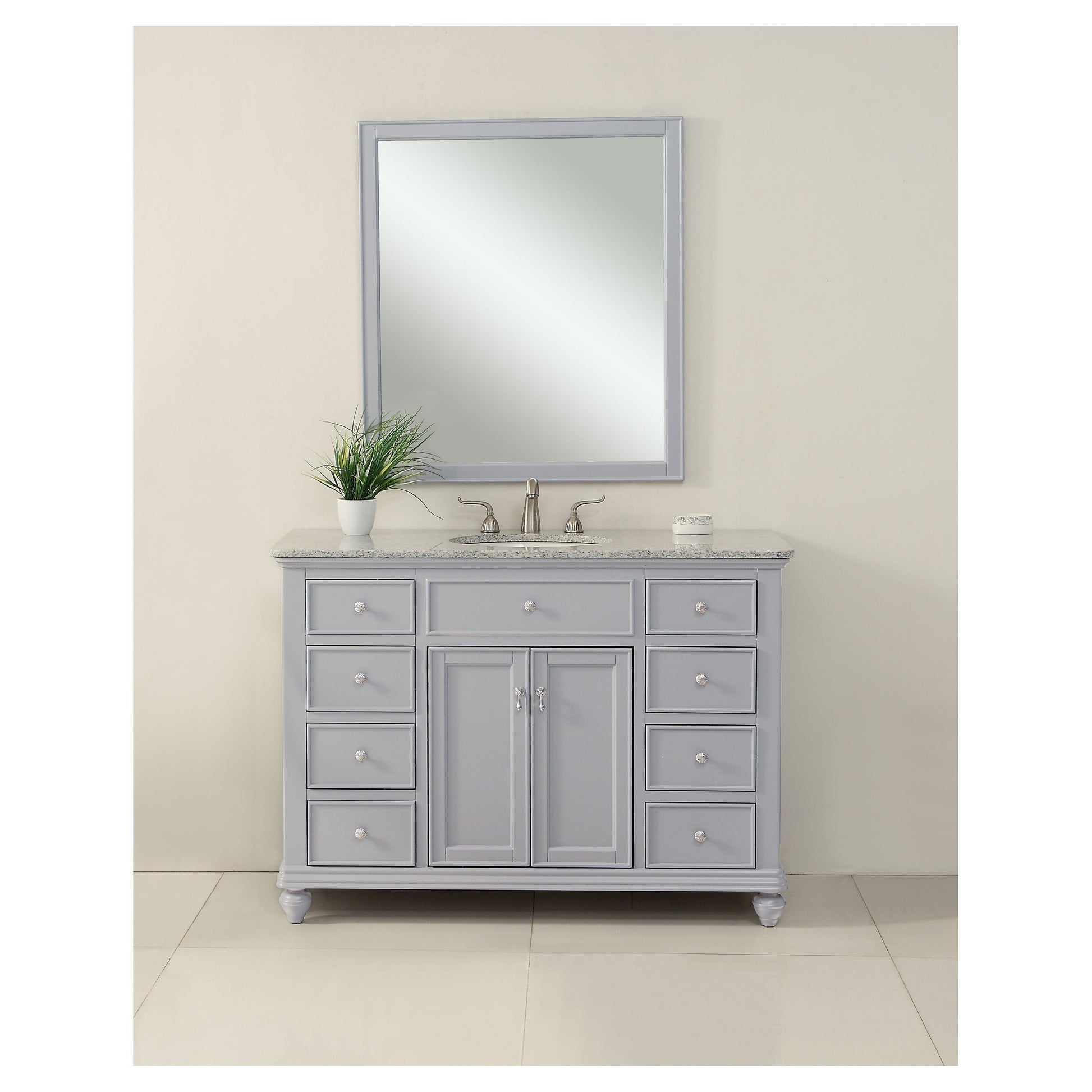 A sleekly styled 4 doors and 8 drawers, granite-topped bathroom vanity like this can only bring a smile of appreciation for its simple beauty and clean lines. With an authentic Kashmir white granite counter top, oval white porcelain sink, hand painted soft grey cabinet, 2 soft-close center doors with a shelf inside, 4 side drawers on each side, brushed steel hardware and carved bun feet, this elegant, transitional vanity balances form and function. Measurements: W48 x D21 x H35