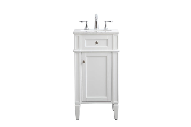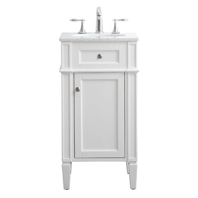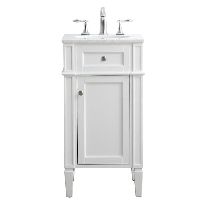 From its Italian Carrara white marble top to its contemporary style handpainted white cabinet, it is sure to enhance either your home or office bathroom. Beneath its lustrous, natural stone marble top is an oval, white porcelain under-mount sink, a handsome single door cabinet with a single shelf, for storing all your bathroom essentials and an array of niceties: chrome steel knobs, soft-closing doors and elegantly tapered legs. A wonderful balance of beautiful form and practical function! "Measurements: W18" x 19" x H35"