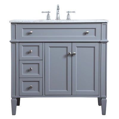 Modern sophistication is defined within the urbane grey finish and brushed steel knobs of this vanity. Its length makes it the perfect addition to any sized home, and saves space with its storage area hidden behind the double cabinet doors and 3 side drawers. Topped with a Carrara white marble counter top and a porcelain sink, this design will add everlasting class to your bathroom and powder room.