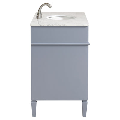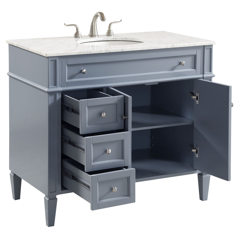 This classic, contemporary marble top vanity console from our "Park Avenue" collection is roomy enough to keep all your bath essentials close at hand. Fitted with a spacious Italian Carrara white marble counter top and an oval porcelain sink, you will naturally enhance your home or office bathroom with both its beauty and practicality. Featuring a hand painted grey cabinet, 3 deep drawers and a set of recessed door with shelf inside, brushed steel knob and tapered leg. measurements: W40"xD21.5"Xh35"
