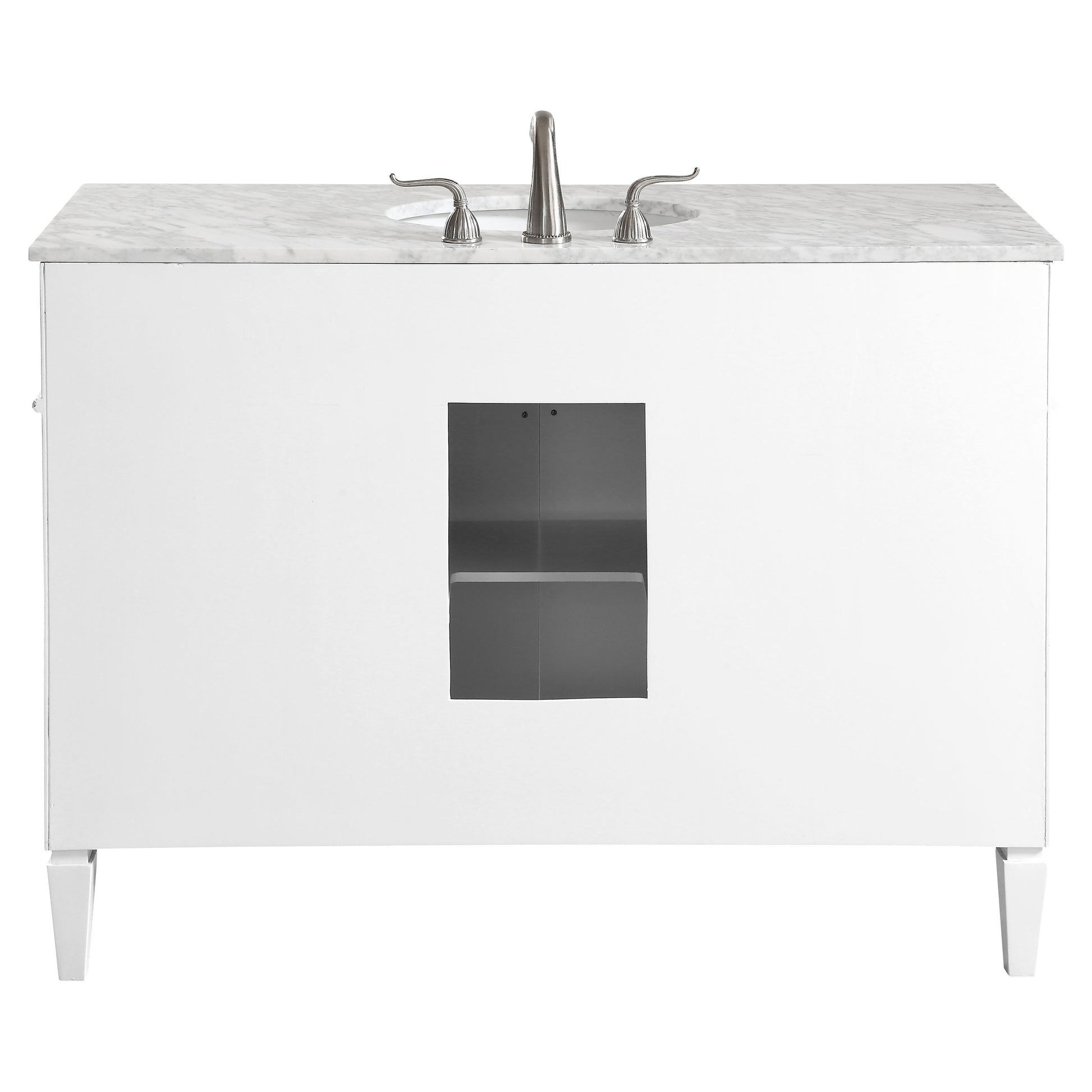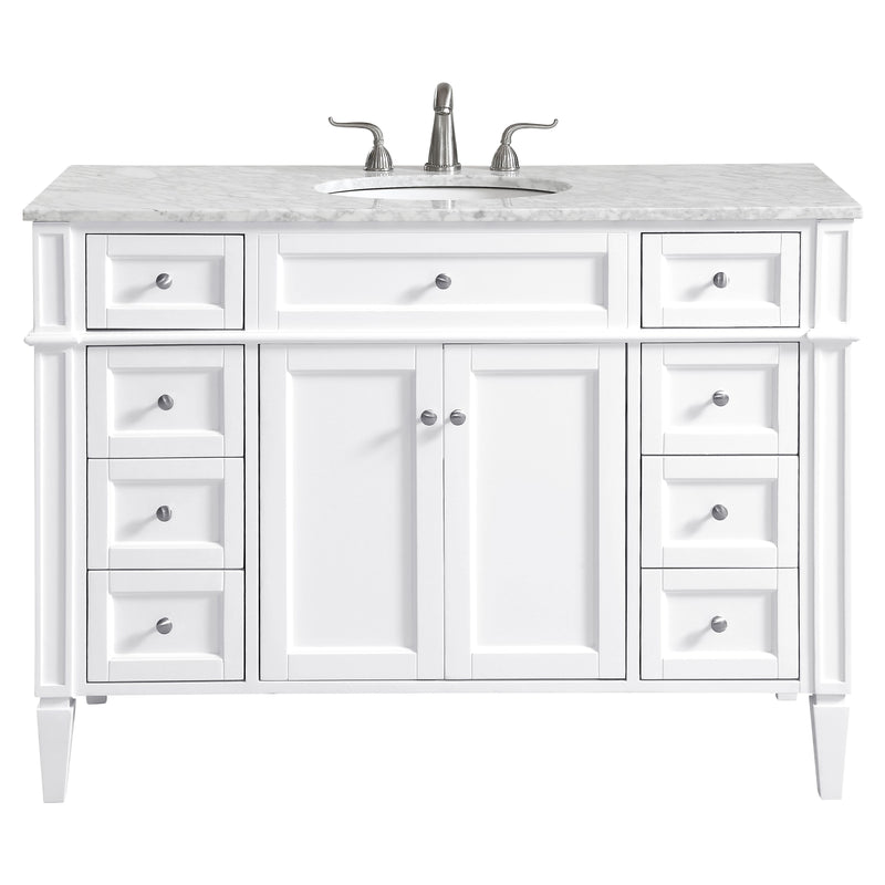 This classic, contemporary marble top vanity console from our Park Avenue collection is roomy enough to keep all your bath essentials close at hand. Fitted with a spacious Italian Carrara white marble counter top and an oval porcelain sink, you will naturally enhance your home or office bathroom with both its beauty and practicality. Featuring a hand painted white cabinet, a set of recessed center door with shelf inside, 4 drawers on each side, brushed steel knob and tapered leg. measurements: W48 x D21.5 X h35