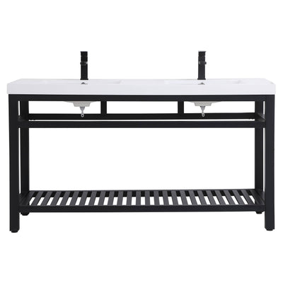 In true minimalistic spirit, this 60" vanity shines with pared down elegance. Bold clean lines build up the metal vanity, creating a modern simplicity that adds visual liveliness and complements any bathroom or powder room. The bottom shelf lets you put away any extra towels or bathroom essentials, and its shining double white undermount sink creates contrast against the finish. Its bold graphic style will create a contemporary style in your home.