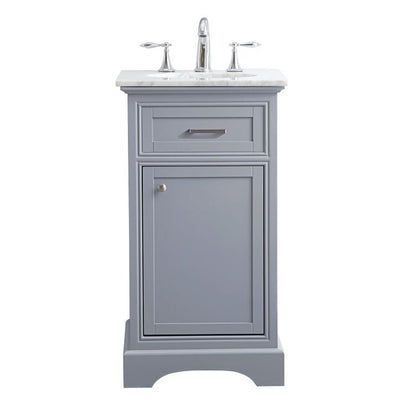 From its Italian Carrara white marble top to its contemporary-styled hand painted Soft grey cabinet, it is sure to enhance either your home or office bathroom. Beneath its lustrous, natural marble top and oval, white porcelain under-mount sink, a handsome single door cabinet with a shelf inside for all your bathroom essentials, highlighted with recessed panel doors, brushed steel bar handle and knobs, stands on a strong solid base . A wonderful balance of simplicity and practical function! Measurements: W19"xD19"xH35"