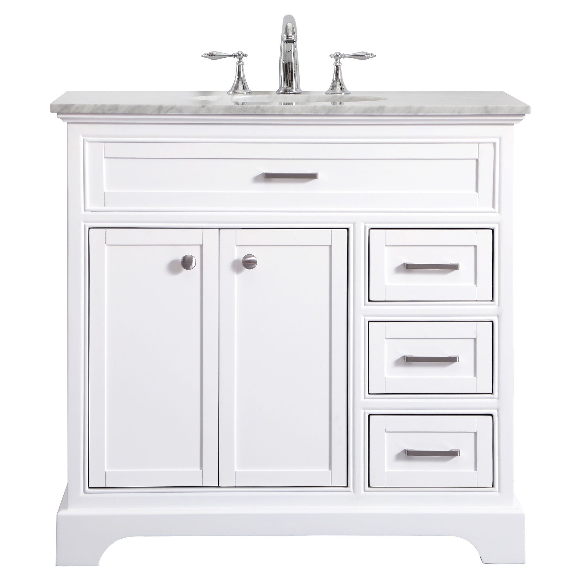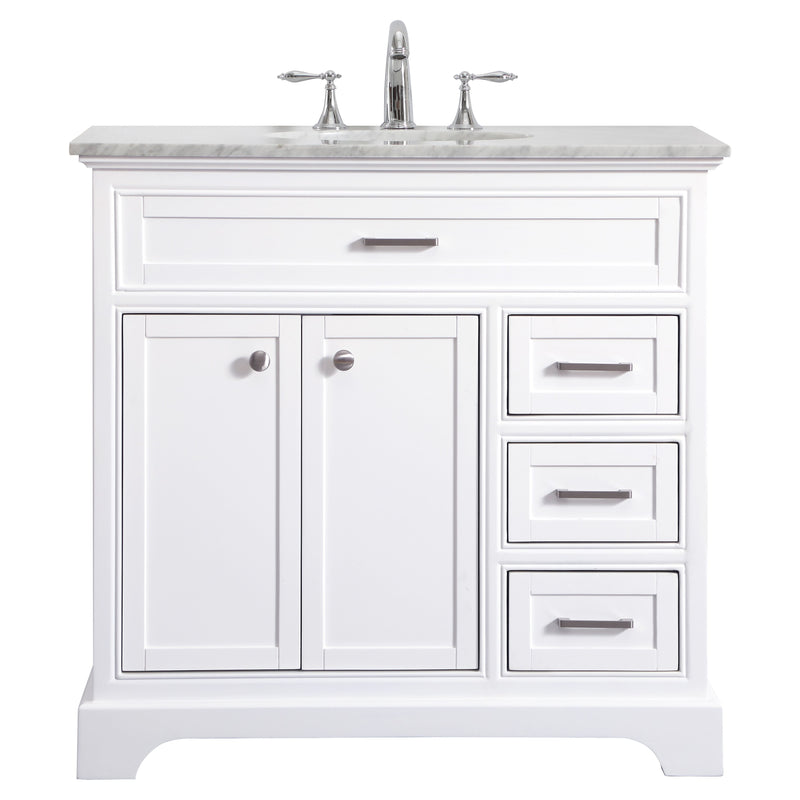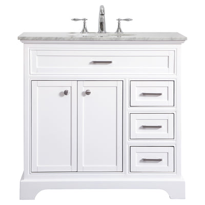 From its Italian Carrara white marble top to its contemporary-styled hand painted white cabinet, this member of our Americana vanity collection is sure to enhance either your home or office bathroom. Beneath its lustrous, natural marble top and an oval, white porcelain under mount sink, is a cabinet with 3 handsome drawers and 2 doors with a single shelf for all your bathroom essentials, highlighted with recessed panel doors, brushed steel bar handle and knobs, stands on strong solid pedestal feet. A wonderful balance of simplicity and practical function! Measurements: W36 x D21.5 x H35