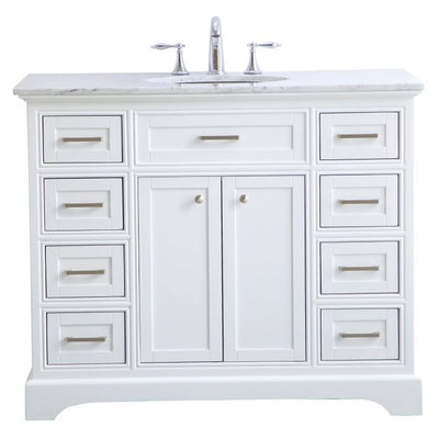 From its Italian Carrara white marble top to its contemporary-styled hand painted white cabinet, it is sure to enhance either your home or office bathroom. Beneath its lustrous, natural marble top and an oval, white porcelain under mount sink, is a cabinet with 3 handsome drawers on each side and 2 center doors with a single shelf for all your bathroom essentials, highlighted with recessed panel doors, brushed steel bar handle and knobs, stands on strong solid pedestal feet. A wonderful balance of simplicity and practical function! Measurements: W42 x D21.5 x H35