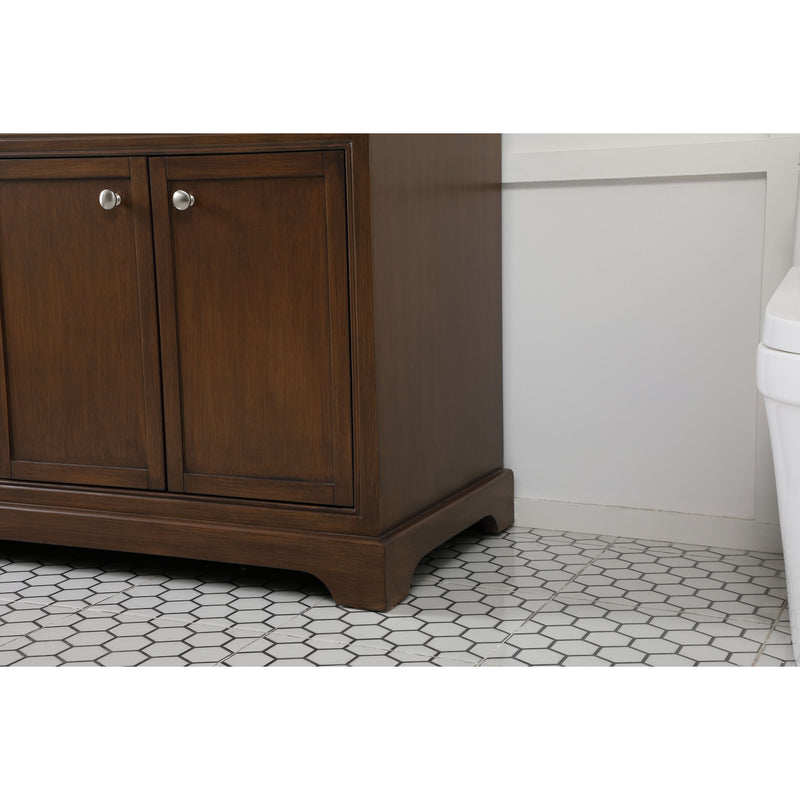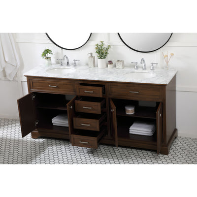 Clean lines and classic form can truly add a fresh look to your bathroom or powder room. This vanity, complemented by round hardware, will surely charm you with its confident style and subtle charisma. This vanity can store all of your bathroom toiletries, from extra towels to make up essentials. The vanity is crowned with carrara white marble and includes a porcelain undermount sink--adding both function and form that will truly amaze.