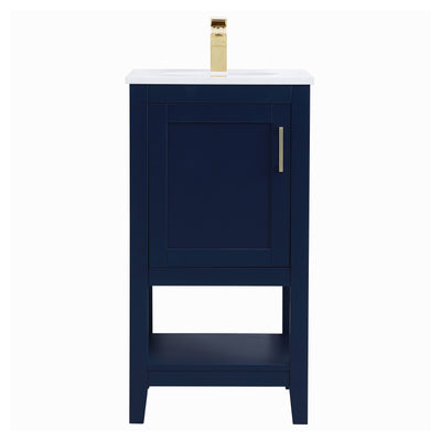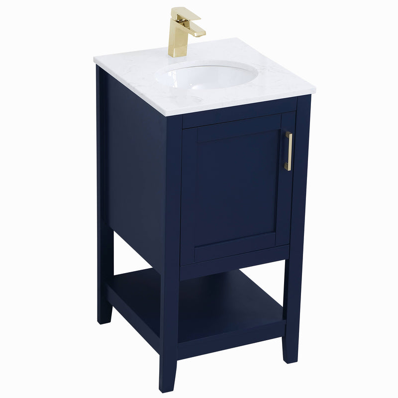 The nonchalant attitude of this 18" traditional Blue finish vanity will have you wanting more. The slender gold handle bar open the cabinet door to reveal an ample storage space to put away and store bathroom essentials, and the open space below allows for you to place clean towels on the rack. Topped with a Calacatta quartz countertop, you and your guests will enjoy this easy going vanity.
