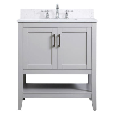 The nonchalant attitude of this 30" traditional grey finish vanity will have you wanting more. The slender brushed nickel handle bars open the two cabinet doors to reveal ample storage space to put away and store bathroom essentials, and the open space below allows for you to place clean towels on the rack. Topped with a Calcatta quartz countertop, you and your guests will enjoy this easy going vanity. Comes with a matching backsplash to complete the look and protects your wall.