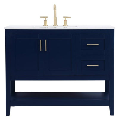 The nonchalant attitude of this 42" traditional Blue finish vanity will have you wanting more. The slender gold handle bars open the 3 cabinet doors to reveal ample storage space to put away and store bathroom essentials, and the open space below allows for you to place clean towels on the rack. Topped with a Calacatta quartz countertop, you and your guests will enjoy this easy going vanity.